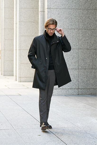 ウールギャバの素材の裏側に、透湿・防水・防風機能を持つ特殊フィルムを張り付けることで、見た目の軽さとは違う機能を併せ持つハイテク素材。ジャケットがギリギリ隠れる絶妙な着丈は、オン・オフ着られる便利な代物。