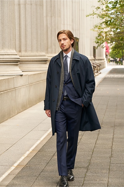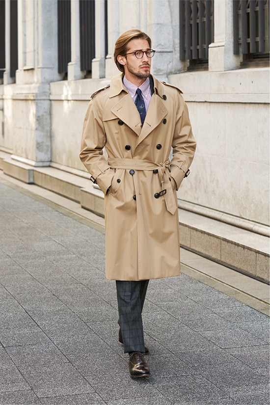 J.PRESSのトレンチコートはいつの時代も変わらないビジネスコートの代表アイテム。日本の老舗ファクトリーで縫製された1着は、着込むほどに味わいが増し、気が付くと数年・数十年と手放せないワードローブになること間違いなしである。