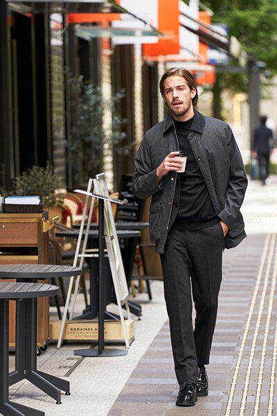 余計なディティールを排除したミニマルなデザインだからこそシャープなシルエットが際立つ。そのために衿周りのパターンには徹底的に拘り、前を開けても閉じてもスマートに決まる。コーデもグレーのワントーンでミニマルに纏めるとより一層シャープさが活きる。