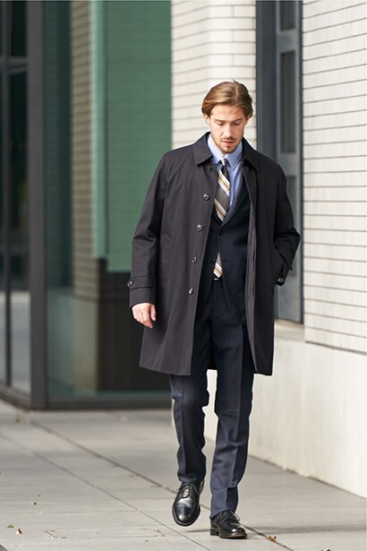 一見するとシンプルなコートだが、使われているコットン素材はJ.PRESSのオリジナル素材。毛羽の出にくいコットンを使用し、糸の段階で染める事で深みのある風合いに。シワになりにくい特殊加工・撥水加工がされているのもビジネスマンの強い味方。
