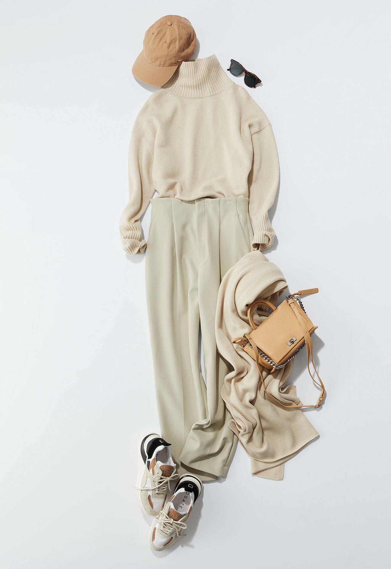 着る人も合わせる服も選ばず、万能なメリノウールのハイネックニット。同色のパンツは、ニットではなく、高級感のあるツイル素材がスタイリッシュな印象です。脚長効果とはき心地を追求したハイウエストパンツは、スニーカーでもバランスよく決まるデザイン。スポーティな小物合わせでカジュアルに着ても素敵です。