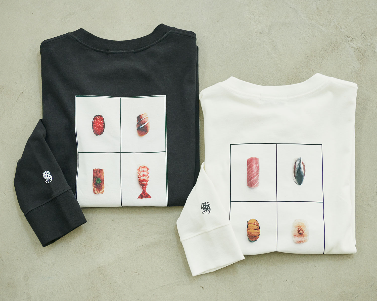 好きを突き詰めていると形になるんだな、と改めて思いました(笑)。とはいえ、鮨通の東原さんと僕でなければあり得ない企画だなとも。普通、鮨を撮るなら斜めからシャリも見える角度で撮るのがセオリーですが、真上から真俯瞰で撮ることでミニマルにコンテンポラリーな写真になるように構図を決めました。個人的には、オーバーサイズにタックインして着て欲しい。女性がUNISEXサイズをゆったり着るのもいいですよね。鮨屋へはもちろんのこと、数人で集まる会など人の気を引きたい時に着て行くと会話が生まれやすくなるはず。こんな「鮨T」はおそらく2度とないチャンスだと思うので、最先端のフォトTを是非いろんなシーンで着てもらいたいです。