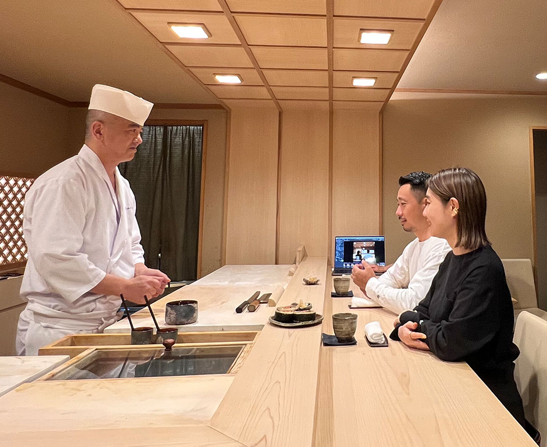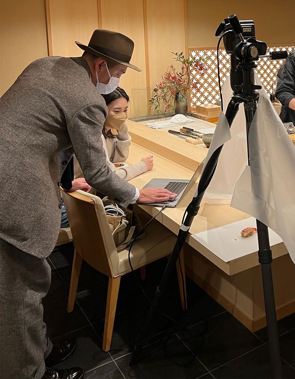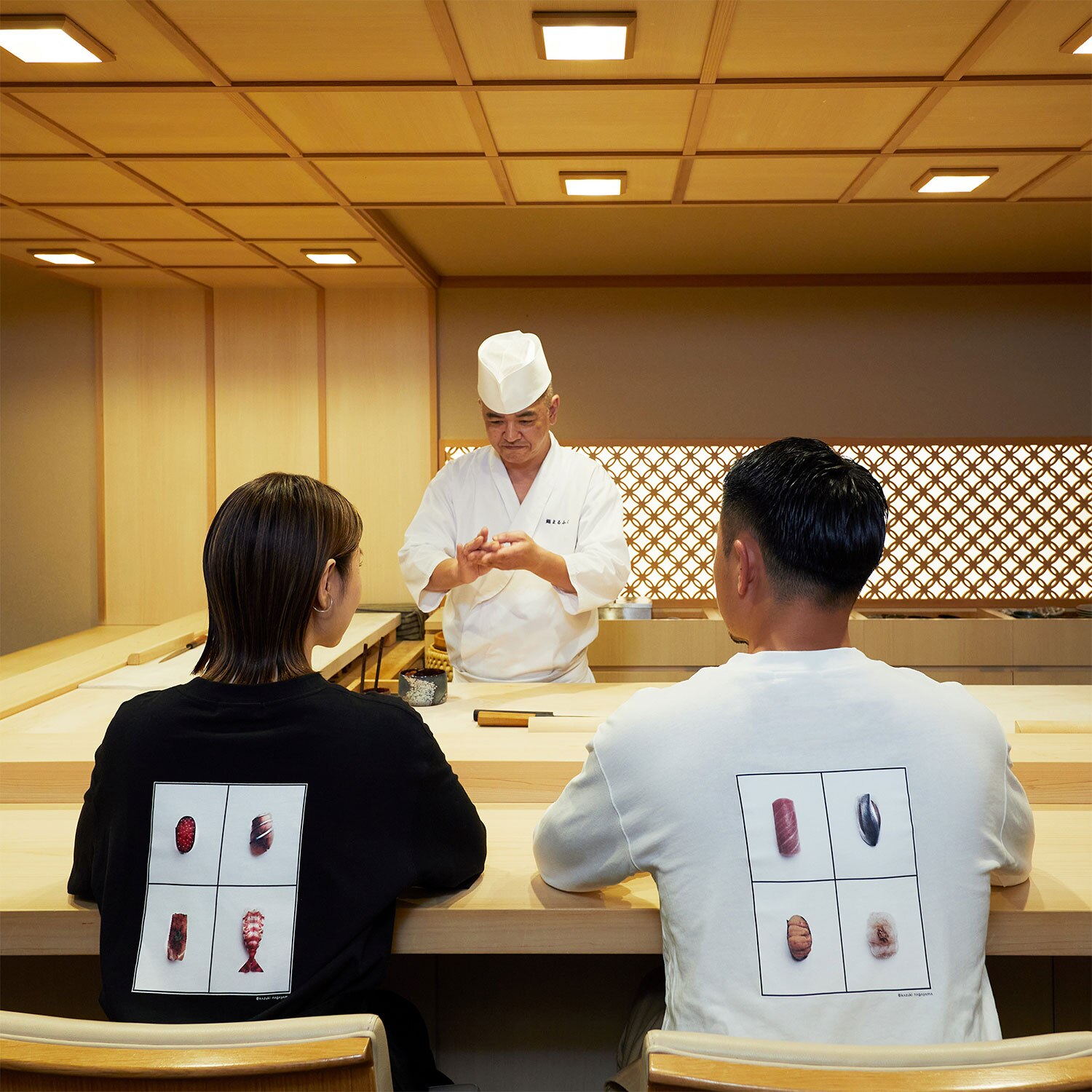 お引き立ていただいている妙子さんとの会話の中で「次は鮨T!」とおっしゃっていて、いつもの楽しい冗談かと思っていたら、まさか本気で鮨をTシャツにするなんて…!握りの撮影当日は、実際にお客様に出す握りとは違い、上から撮って絵になるように握ることが思いのほか難しかったです。ファッション業界の第一線で活躍されているお二人が真剣にお鮨を撮影している姿は、不思議な光景でしたがとても光栄でした。そして、完成した「鮨T」を着用しての撮影は、なかなか皆の予定が合わず営業終わりの深夜集合となりましたが、お二人がかっこよく着こなして登場された姿に感動しました。弊店は、魚を寝かせて熟成させ魚のもつ旨味や香りをしっかり出すように仕立てて握る熟成鮨を提供しております。今回のコラボを通して弊店のことを初めて知って頂いた方も多いと思いますが、「鮨T」を着てご来店のお客様には、ビール一杯をサービスさせて頂きます! 是非お待ちしております。
