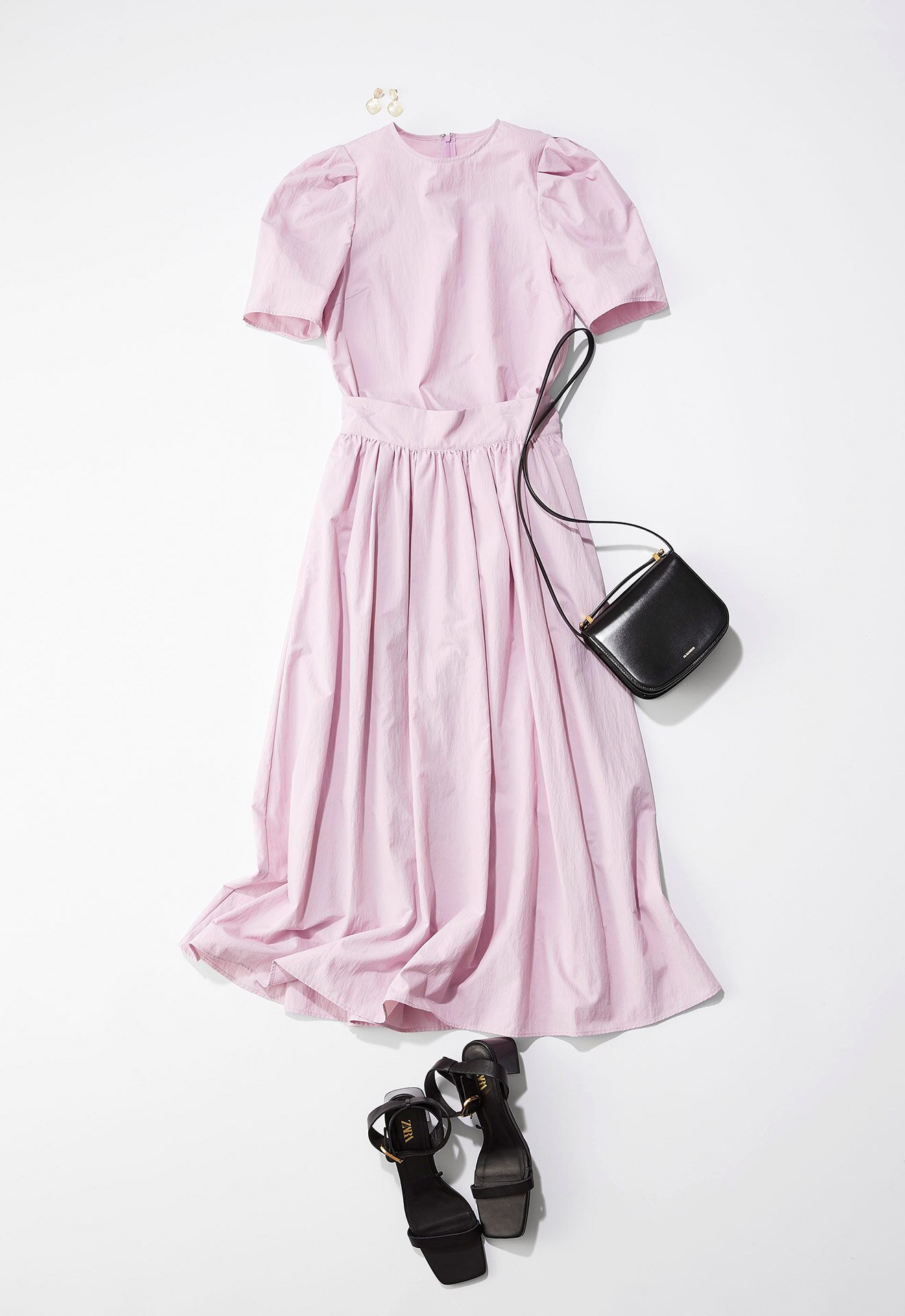 ギャザーたっぷりの甘めなシルエットですが、コットンライクな風合いの生地なので、緊張度が高くなり過ぎずデイリーに使いやすいスタイリングに。