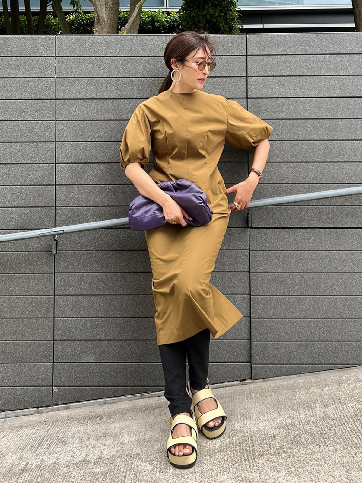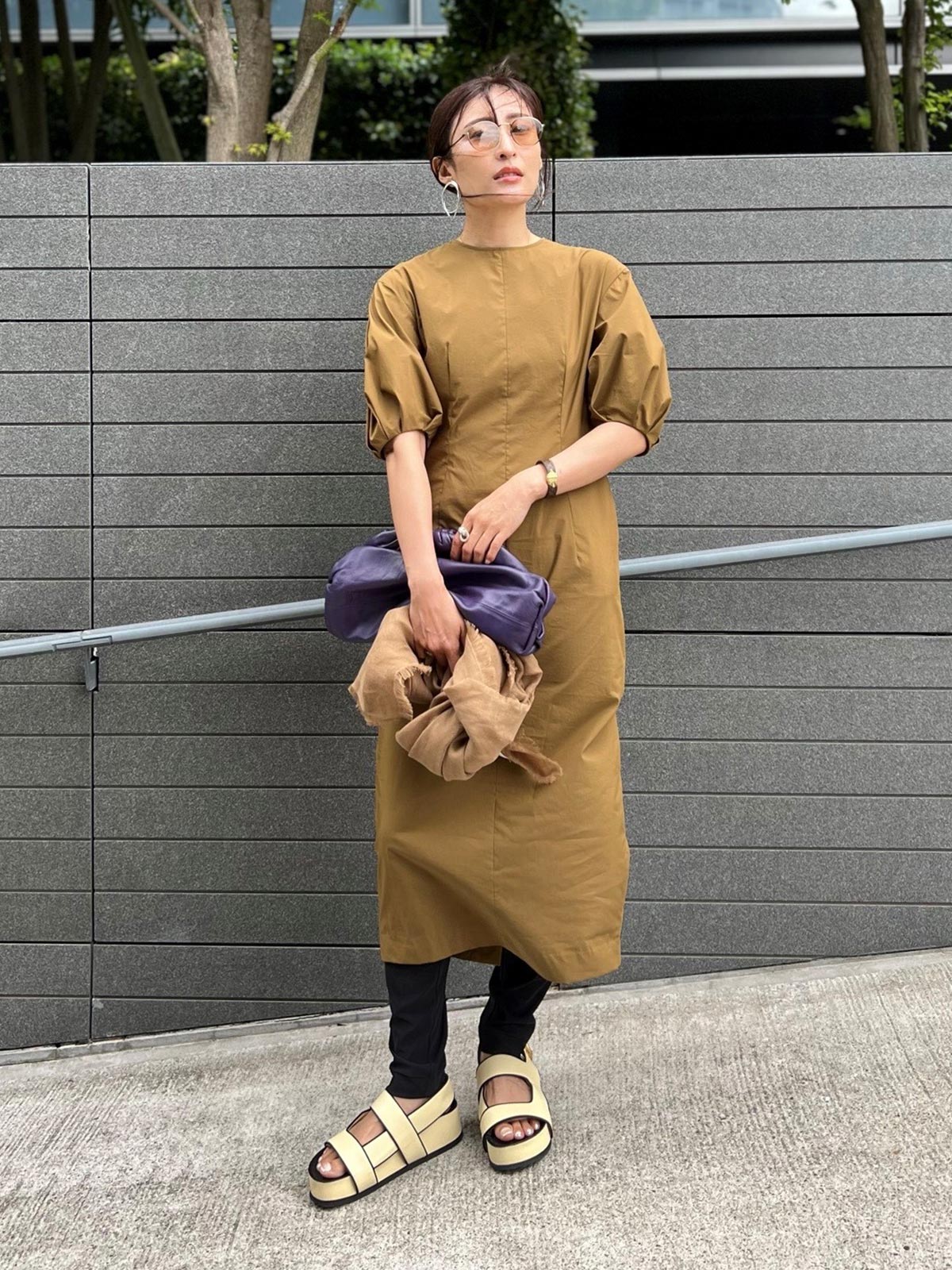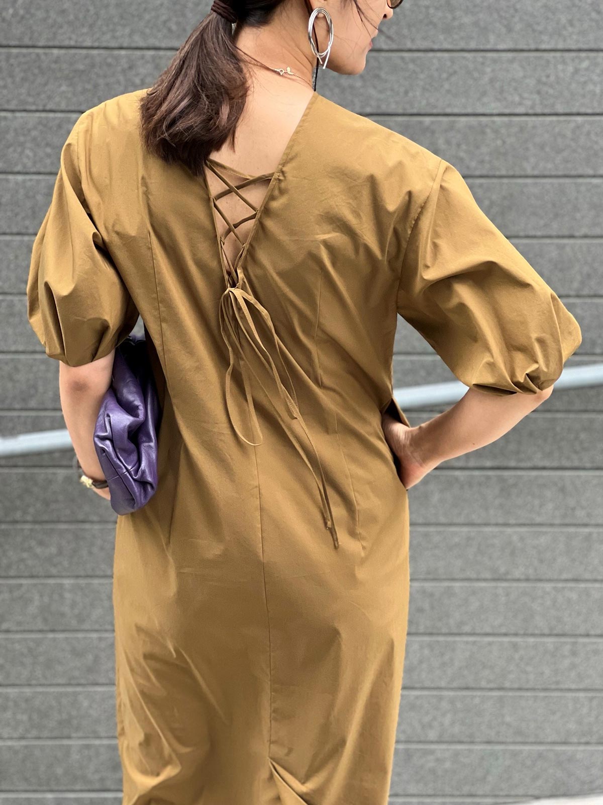 「なじみがよく肌がきれいに見える上品なキャメルのワンピースは、撥水なので汚れを気にせず着られるのも嬉しい。今日はスリムパンツと厚底サンダルを合わせて、カジュアルダウンしました。背中開きのバックスタイルが華奢見えする、お気に入りの一枚です」