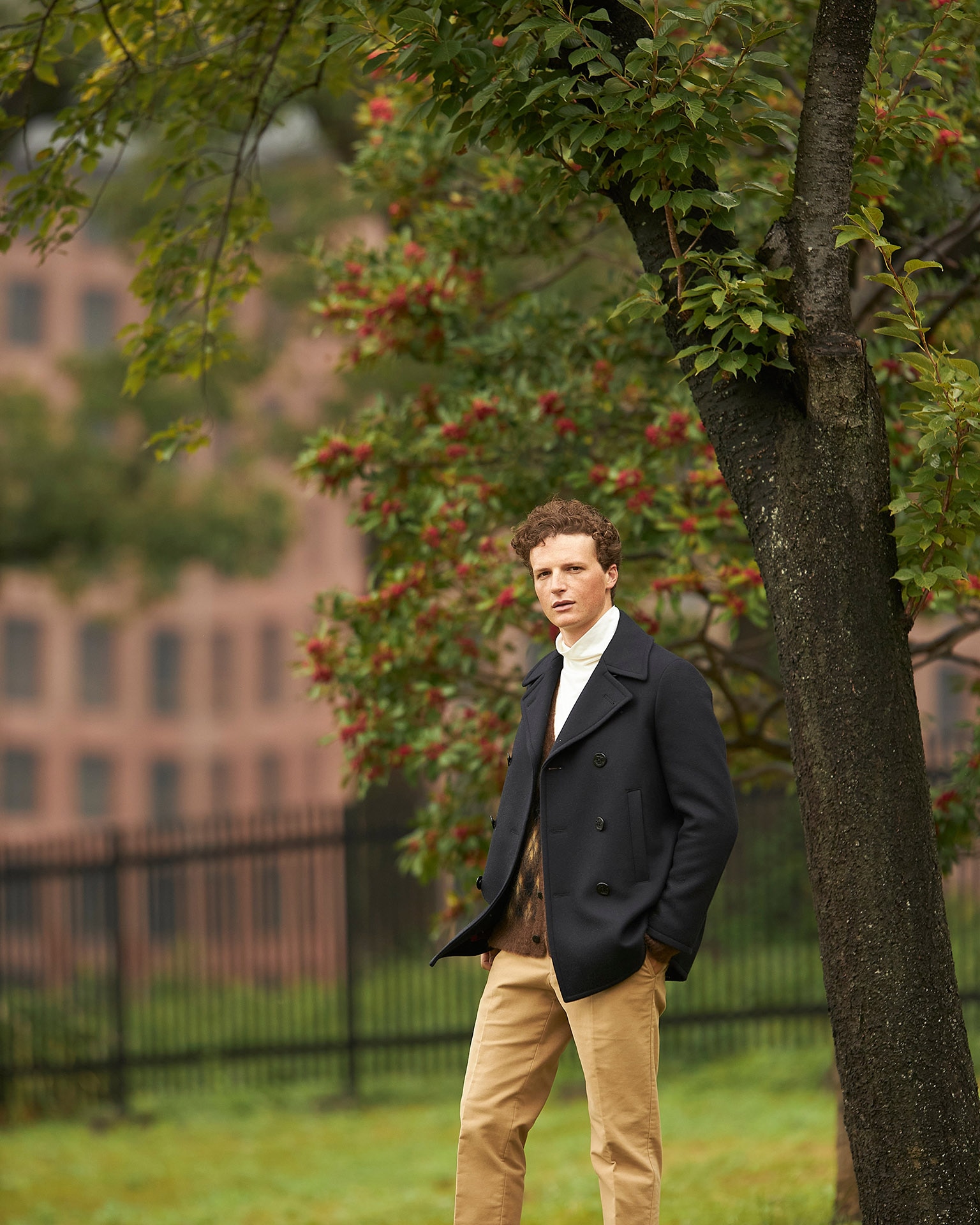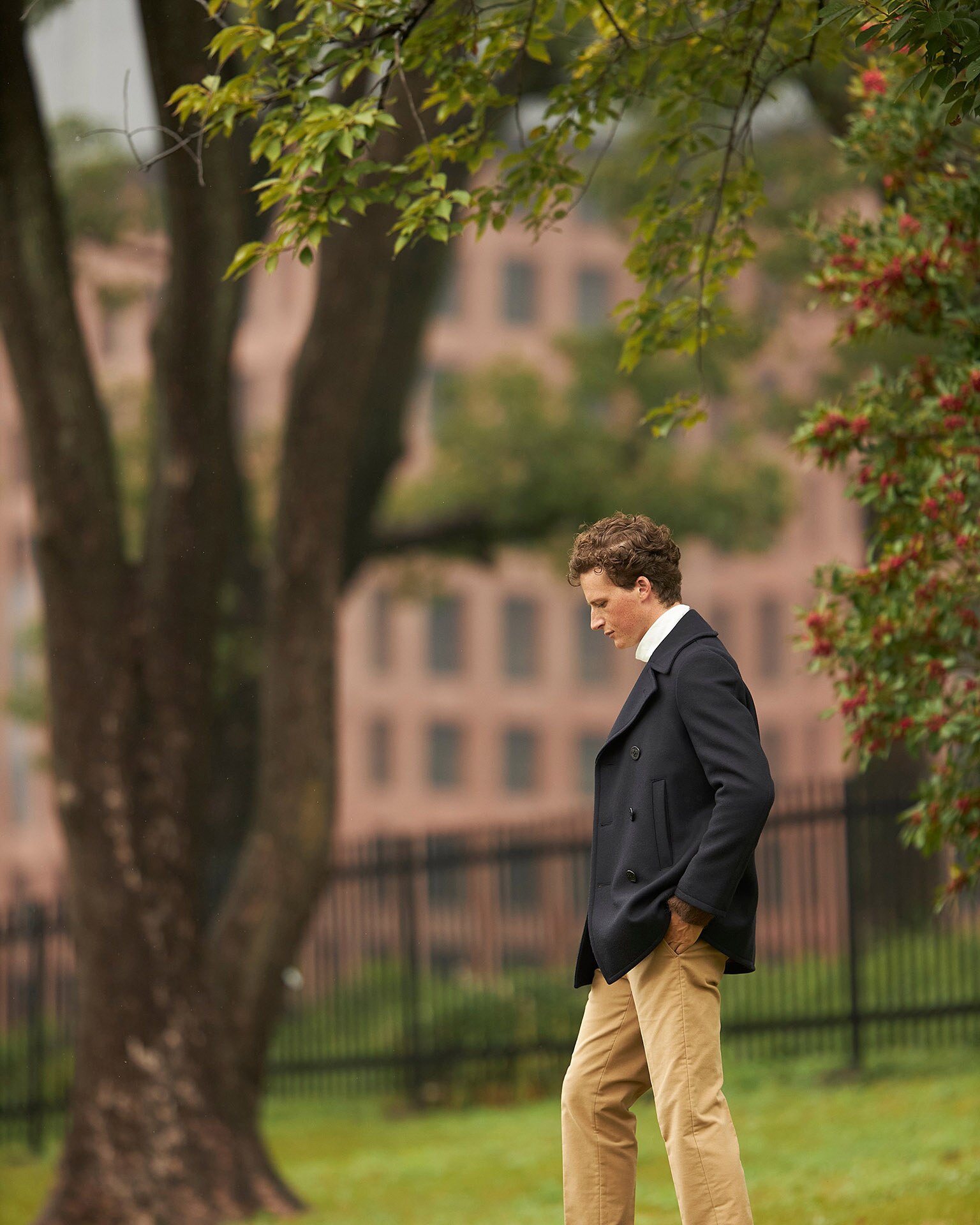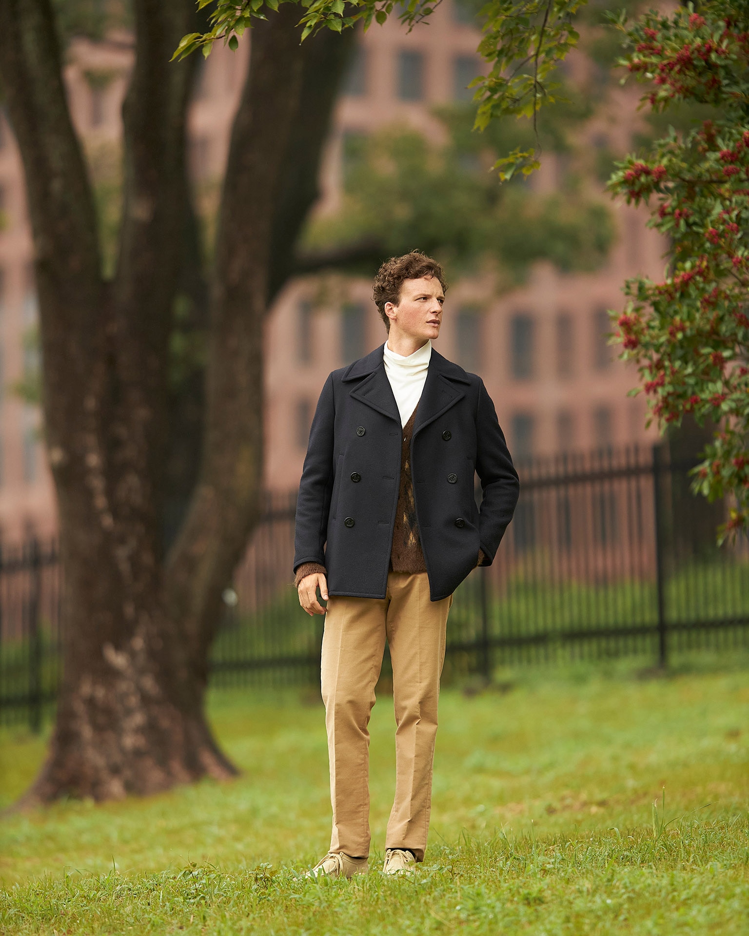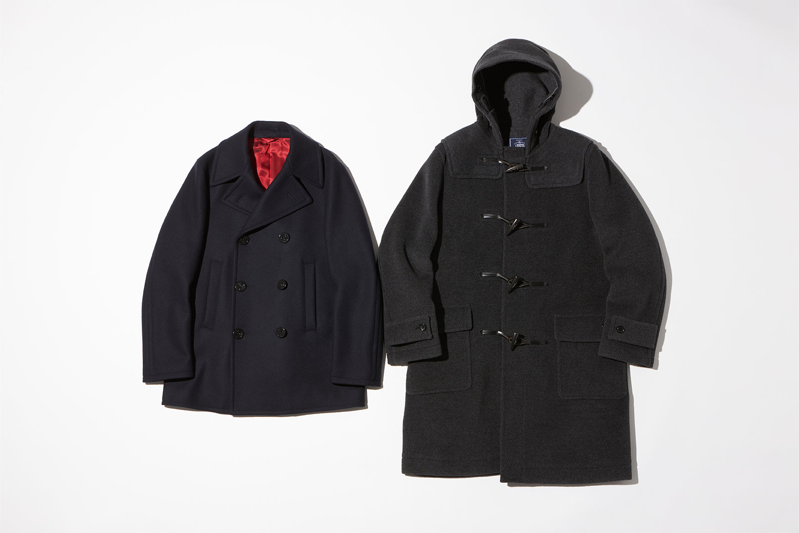 このピーコートは、従来のデザインから肩が誇張されないナチュラルショルダーのディテールワークに変更され、アメリカ軍のリーファーコートをベースにテーラードに仕上げられています。