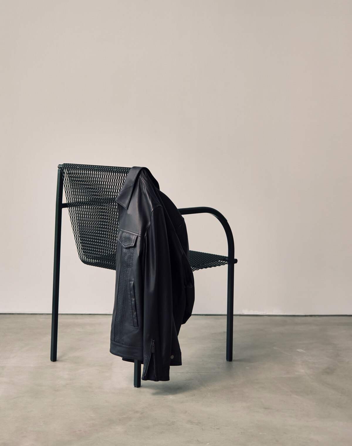おなじみのジャケットも、レザーを変えると印象ががらりと変わる。ライトゴートシュリンクレザー特有の細やかなシボがラムスキンとはひと味違うマスキュリンなムードを醸成する。