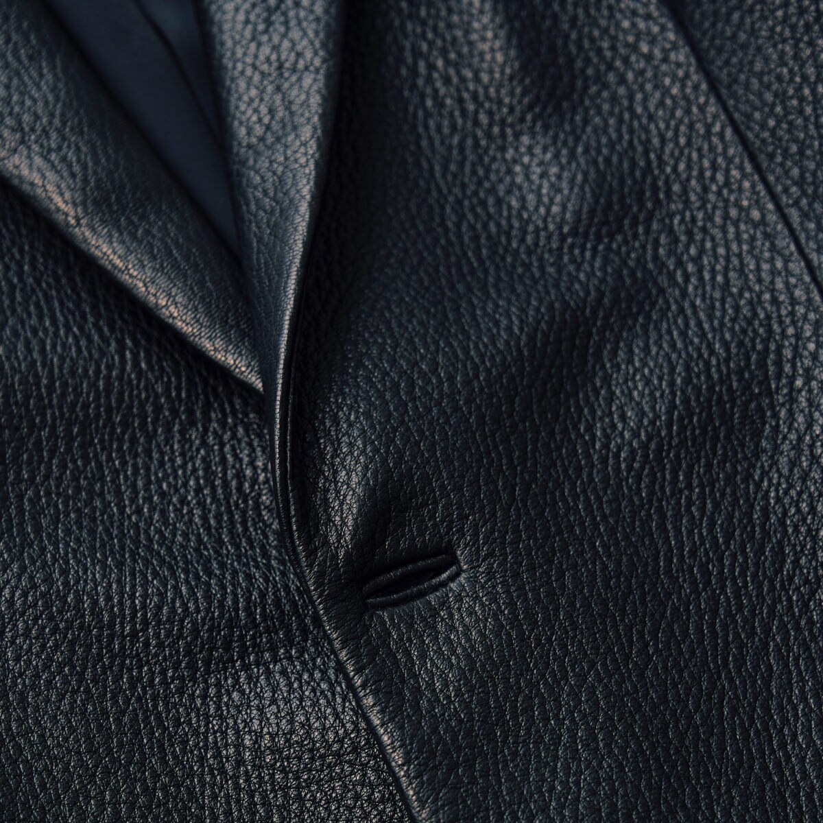 ディテールの注目ポイントはボタン穴。レザーウェアの場合、糸でかがる通常の穴だと強度に不安が残るため、手間のかかる丈夫な両玉縁仕上げに。さらにステッチを目立たなくするなど、細部まで職人の工夫が凝らされている。