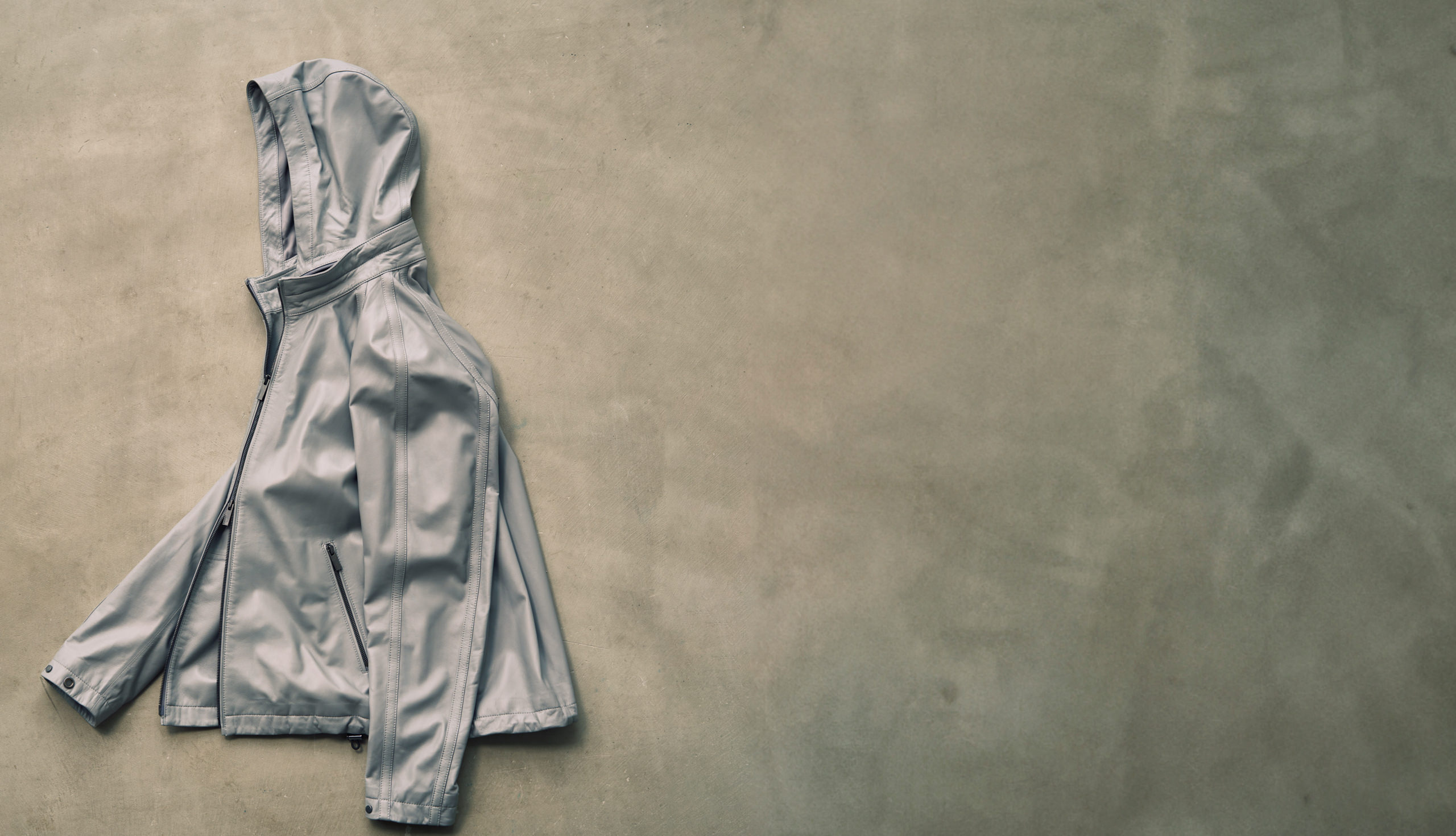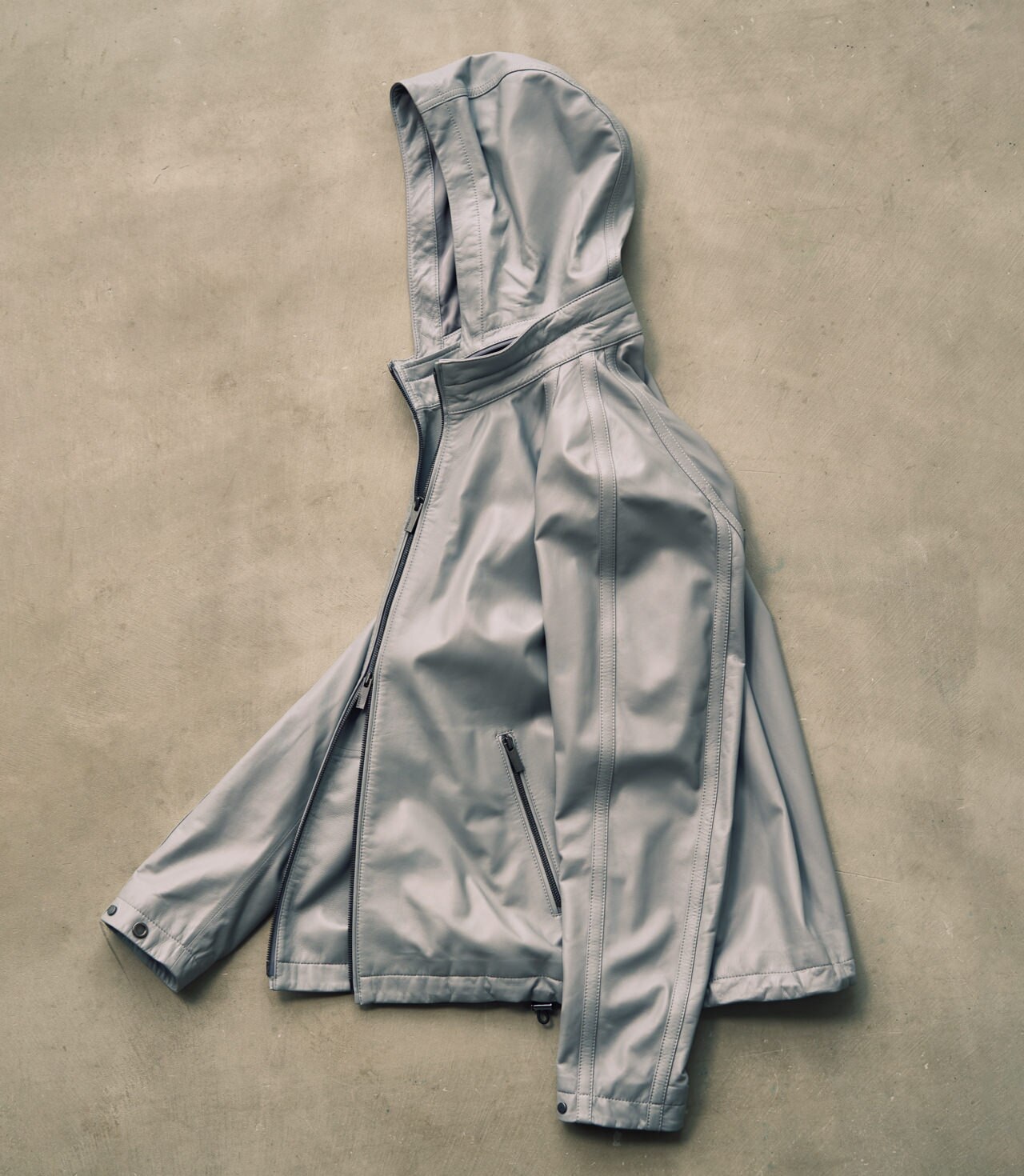 レザーウェアでは珍しいフーディータイプ。スポーティなアクセントをきかせるフードは、ファスナーで取り外しが可能。スタンドカラーのブルゾンとしても着ることができる2WAY仕様に。