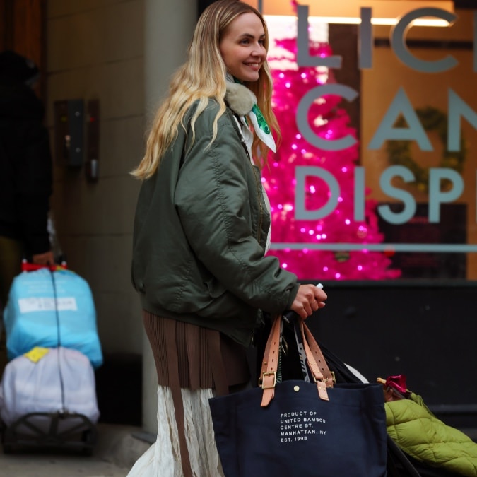 鮮やかなグリーンカラーのダウンに眼鏡、トートバッグが目を引く個性的な彼女は、俳優を務めるロズさん。とにかくグリーンが大好きとのこと。ホワイトの “ミニ” トートを差し色にした冬のダウンスタイルは、スポーティーでありながら、品の良さも感じられる。スナップ後に「オーディションに遅れちゃう!!」と言いながら、笑顔で走り去って行く姿がとても可愛らしかった。