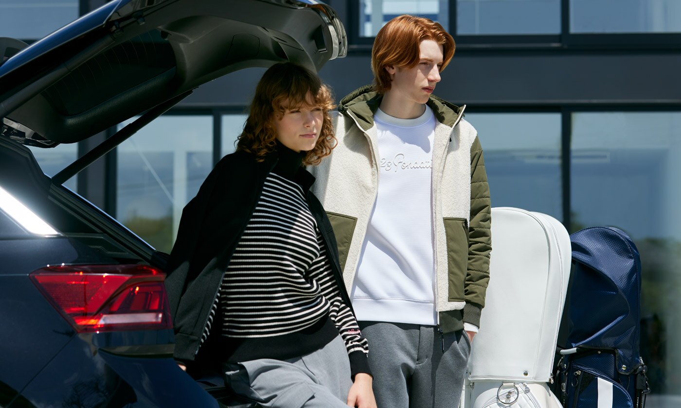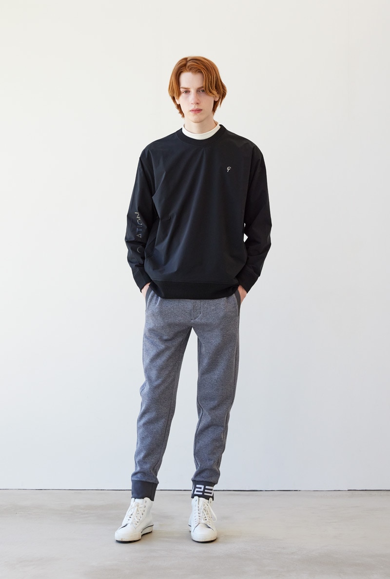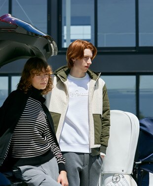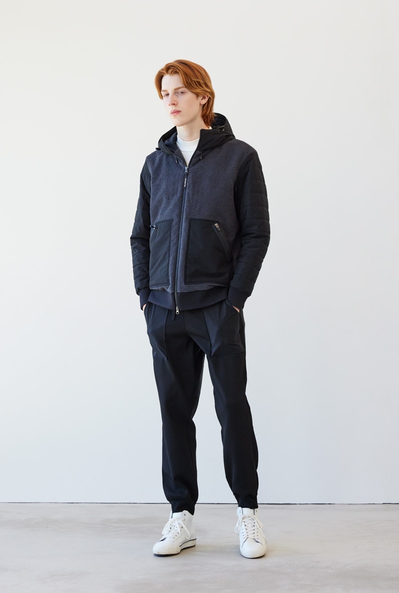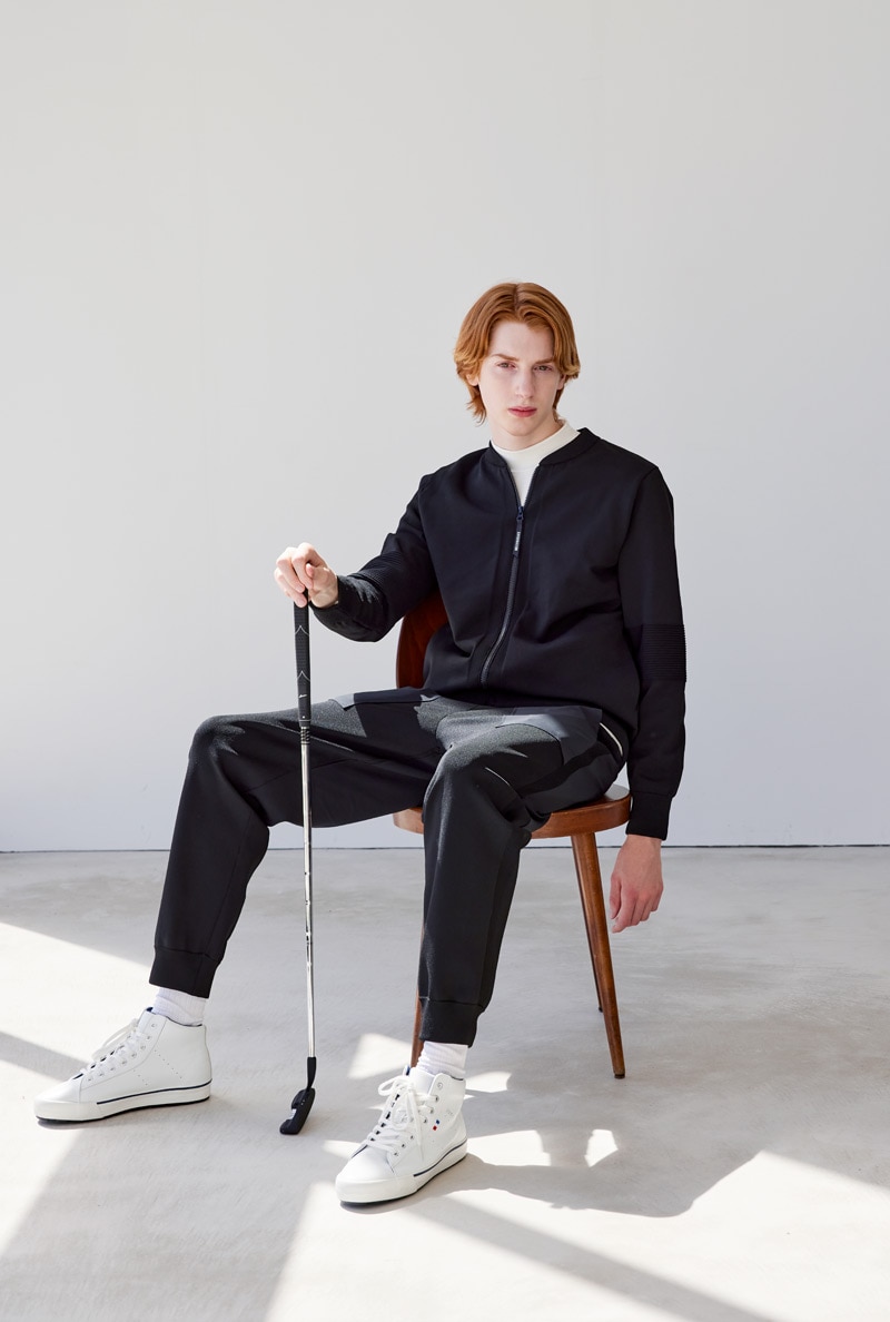 Mens_ゴルフの練習や外出に最適なアスレジャースタイル。ボアとタフタ素材の中綿ブルゾンに合わせた23Fondationを代表するジャージーパンツは、柔らかな風合いと適度なテーパードで上品な逸品。