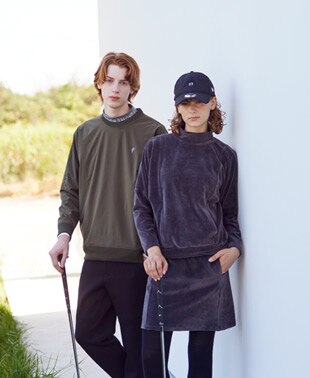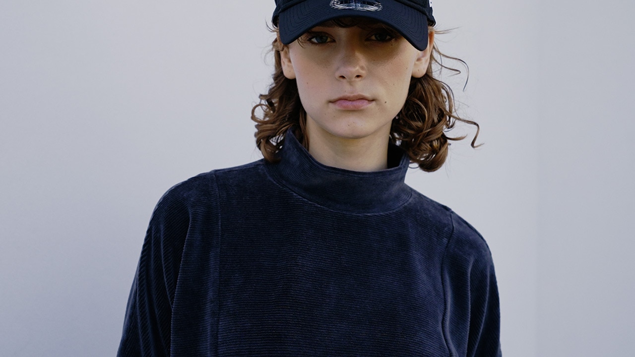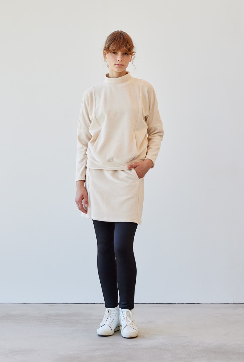柔らかなストレッチコーデュロイ素材のセットアップスタイル。緩めのハイネックとドルマンスリーブがフェミニンなアイテム。