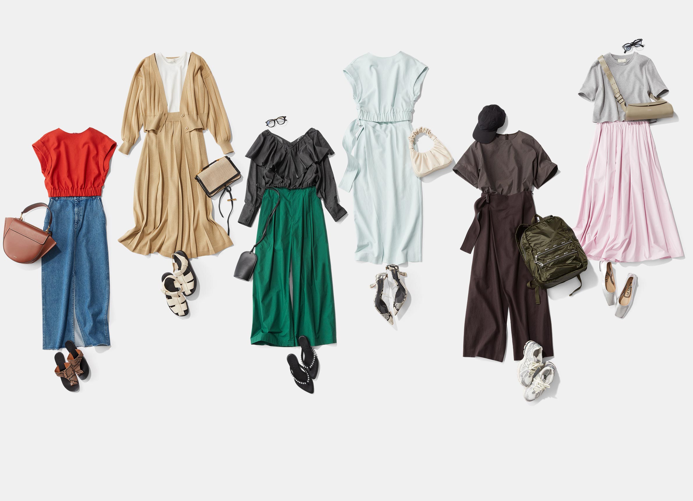 「目に鮮やかなのに、シックで洒脱に見えるのがグリーンの魅力。軽やかなタイプライター素材と、フォレストタックのワイドシルエットはトレンド感満点! シンプルにTシャツ合わせでも様になるけれど、シャンブレーのフリルブラウスで夏らしいゆるいフェミニンさをプラスしました」(東原さん)
