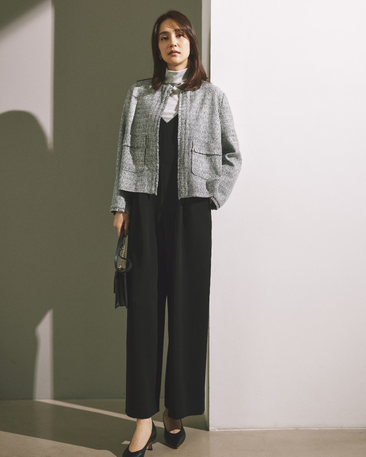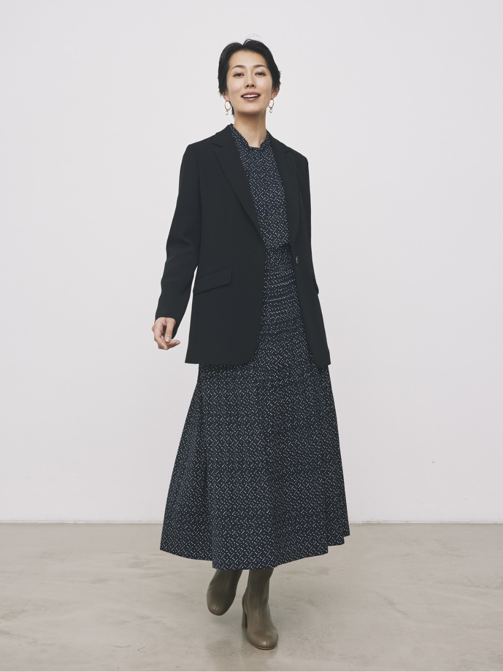 王道のテーラードジャケットを、ゆとりを持たせながらも、ウエストをやや絞ったすっきりシルエットで仕上げました。ヒップをカバーしてくれるよう丈感は長めに。同素材のパンツと合わせても、総柄のセットアップにさらりと羽織っても。