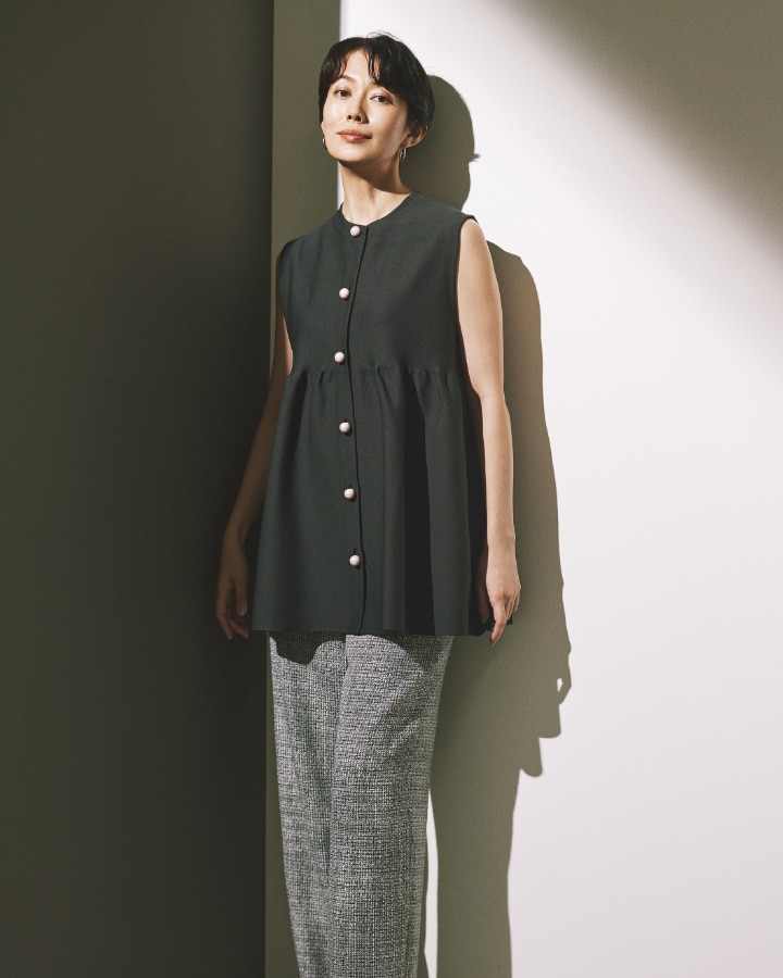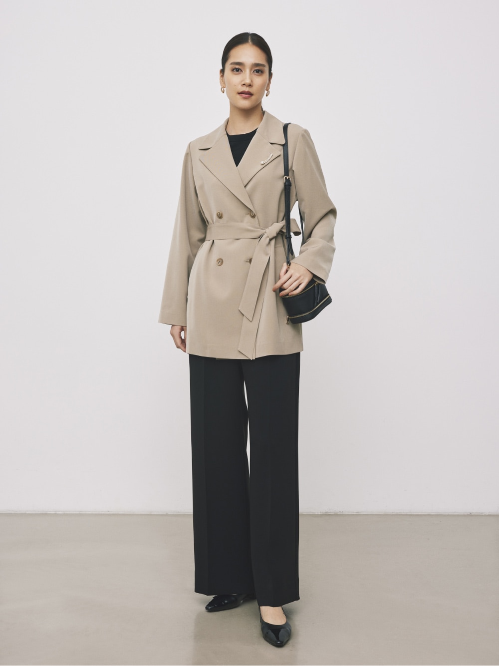 フォーマルにも仕事用にも着回せて、また、スカートにもパンツにも合わせやすいミドルレングスのトレンチ。ダブルの前あわせは生地の分量をたっぷりとって女性らしく。背中は二重構造になったアンブレラヨークを配置。後ろ姿もサマになる一着です。