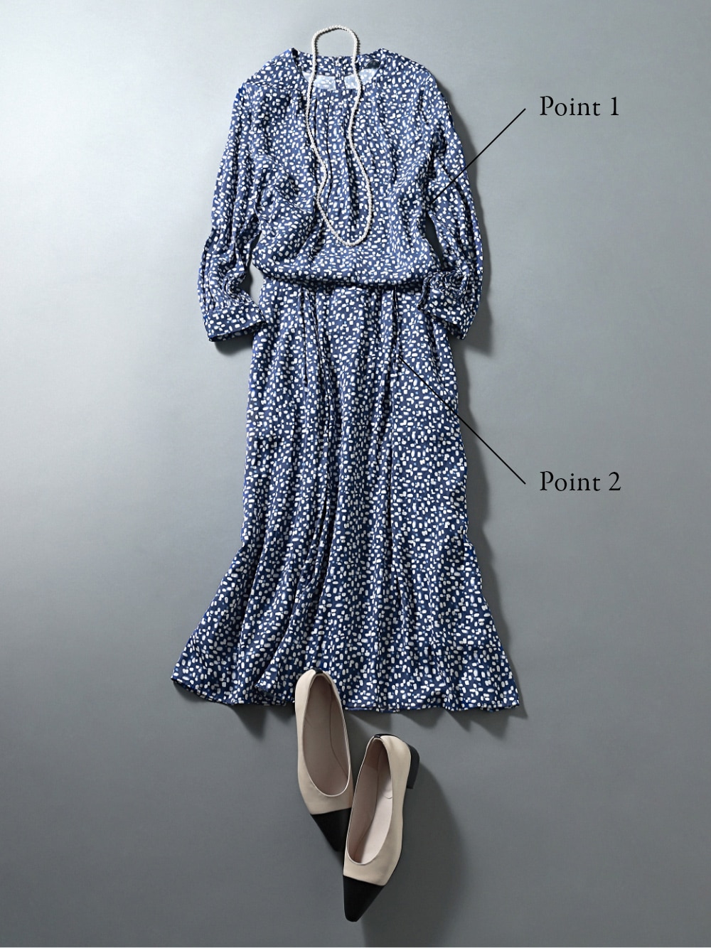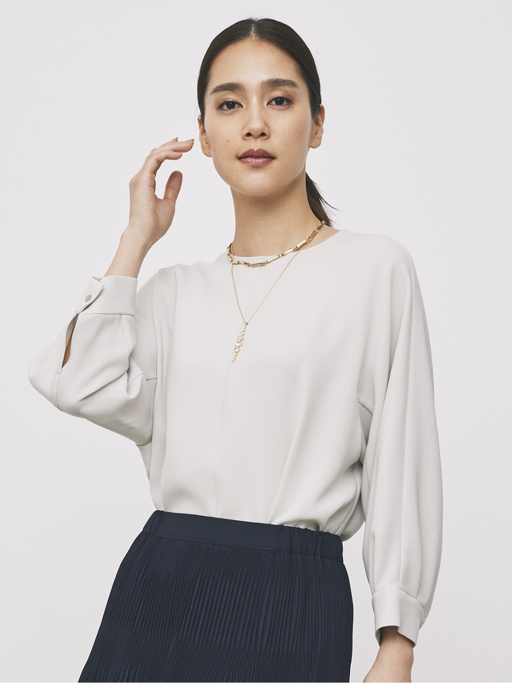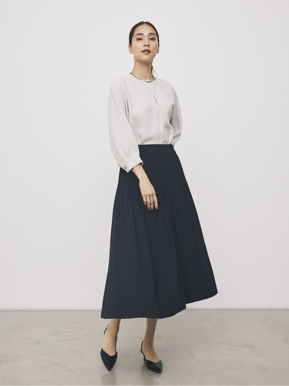 繊細なプリーツをあしらったスカートは、きちんと感と女性らしさを両立した今季の一押しアイテム。素材は、張りとドレープ感があり、また、程よくストレッチが効いたライトサテン生地を厳選。動くたびに揺れる裾の表情も美しい一枚。