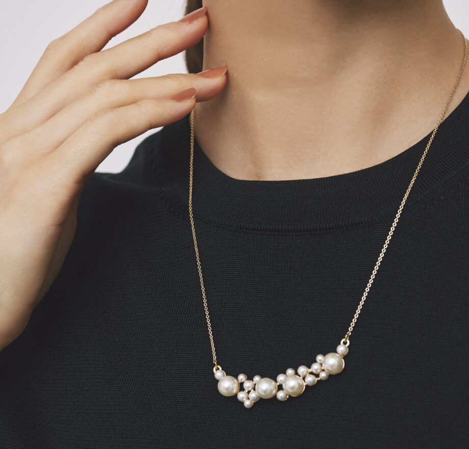 さまざまなサイズのパールをランダムに配置したネックレス。アートピースのような大胆なデザインが、装いに大人らしい遊び心をプラスしてくれます。ショートレングスなのでパーティやかしこまったシーンの装いに。