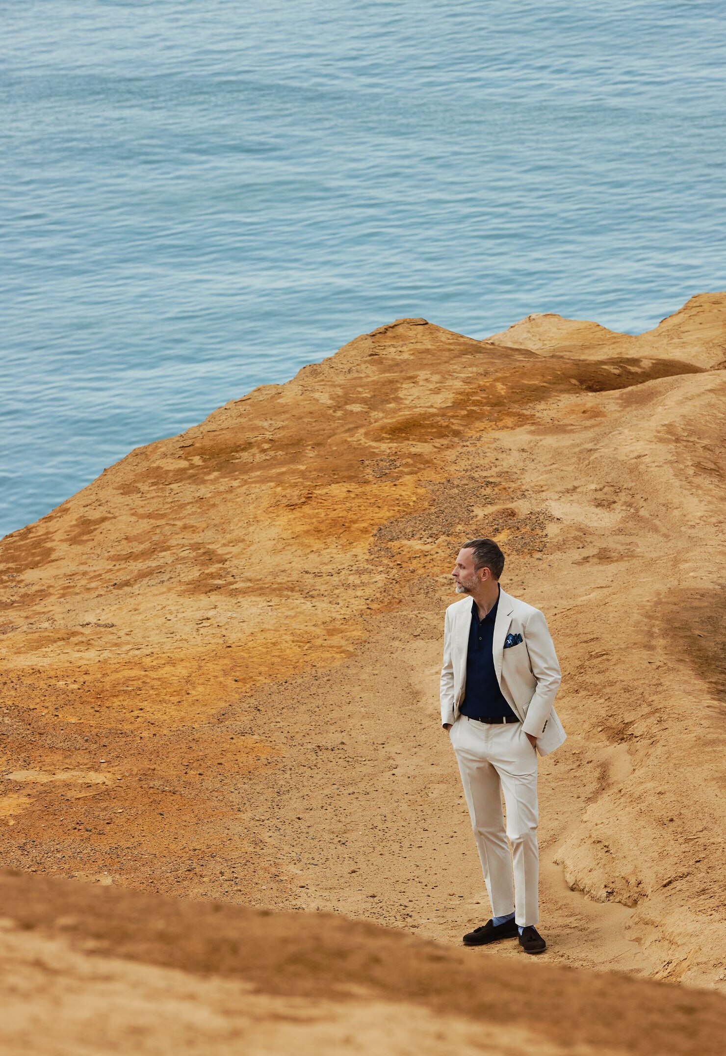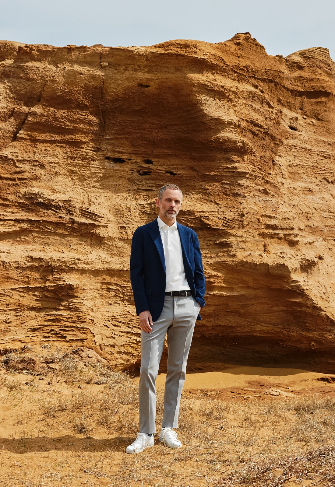 肩肘張らない自然体の着こなしで、大人の余裕を感じさせるセットアップ×ポロシャツの好例。美しいシルエット、肌触りの良さ、フィット感の高い快適な着心地も叶えてくれる日常の相棒的存在。