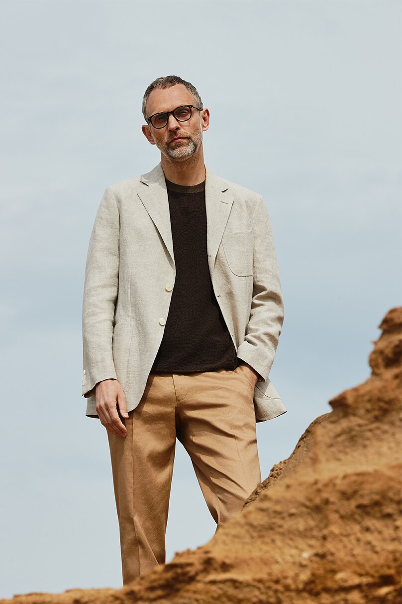 独自開発の特殊な染色法を用いた、絶妙なカラーリングが魅力の上質リネンジャケット。同系色&同素材のドレスパンツ×ニットTシャツと合わせて、シャープかつモダンな仕上がりに。