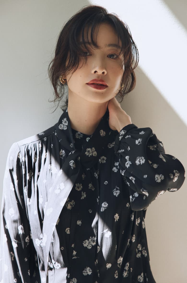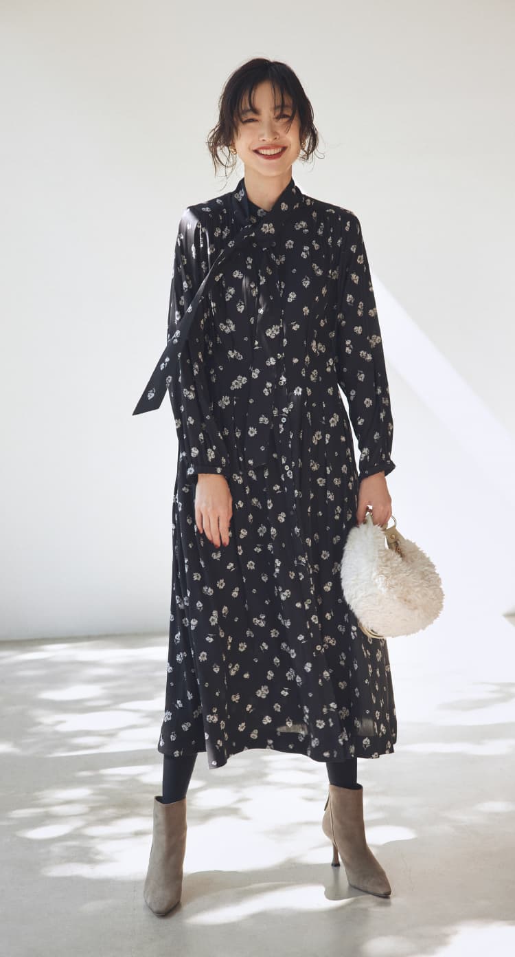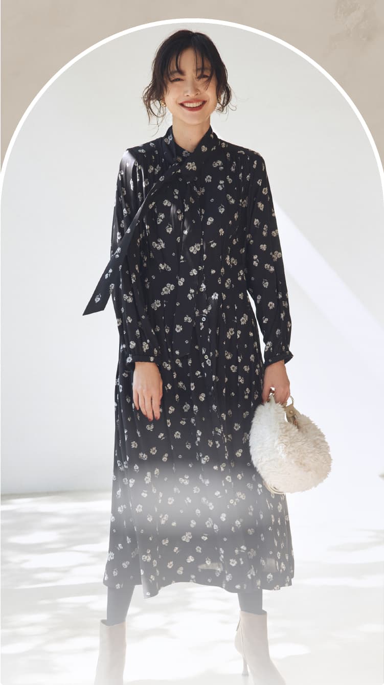 何歳になっても惹かれる花柄はシックな黒ベースを選べば大人の表情に。流れるようなフレアシルエットと落ち感のある素材が