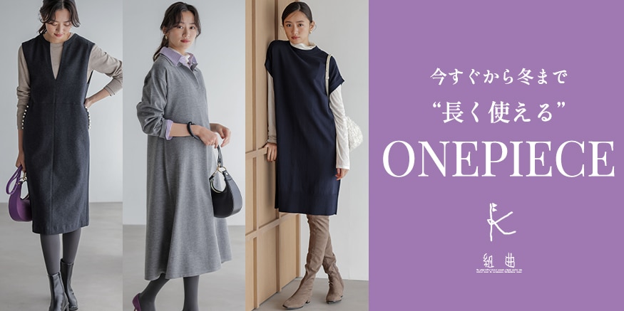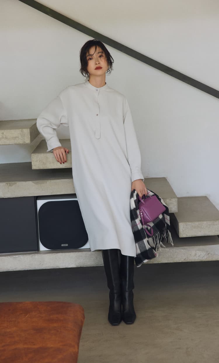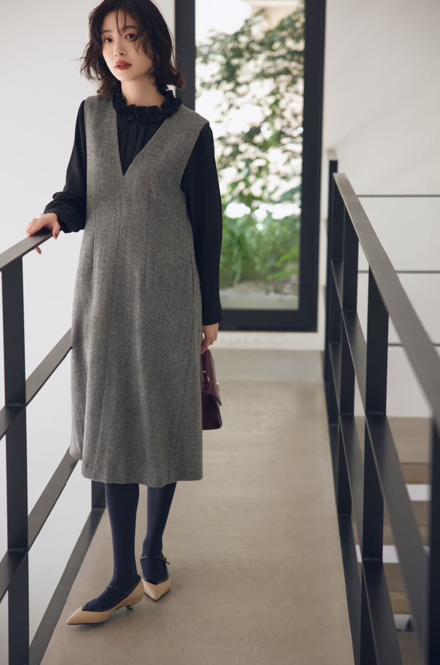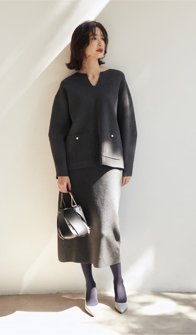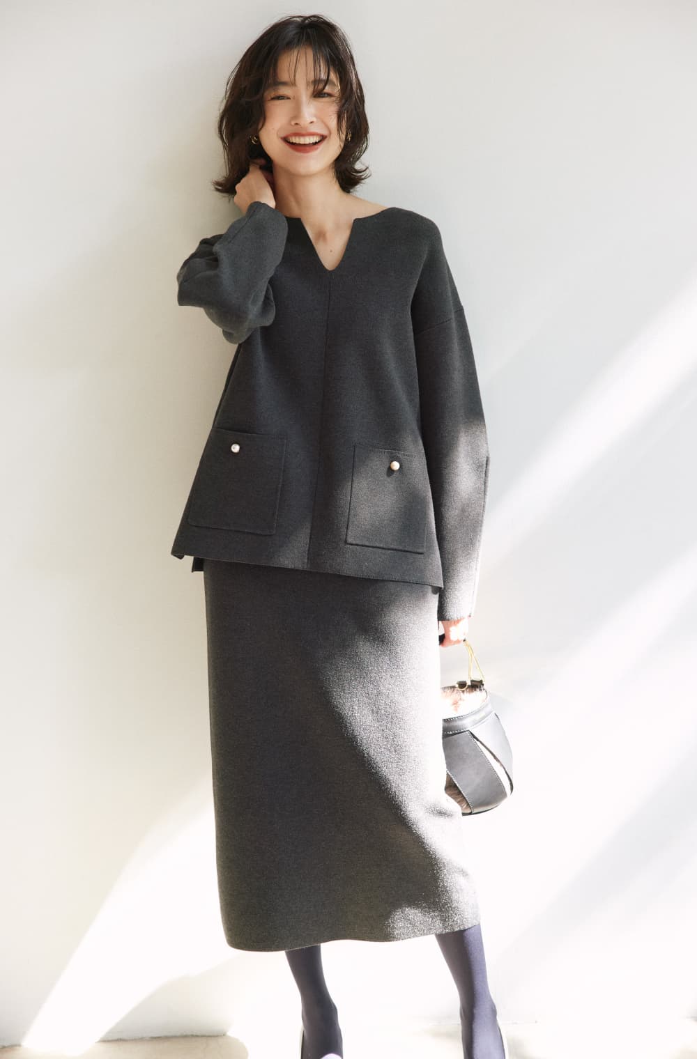 一枚ではもちろん、Tシャツやブラウスと重ねても決まりやすい襟のあき具合、すっきり見えつつタイトすぎないスカートのシルエットが秀逸。