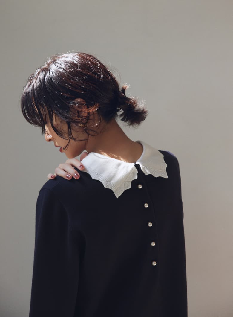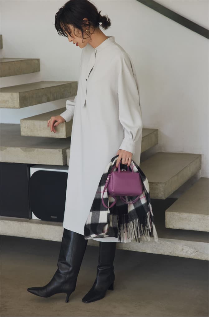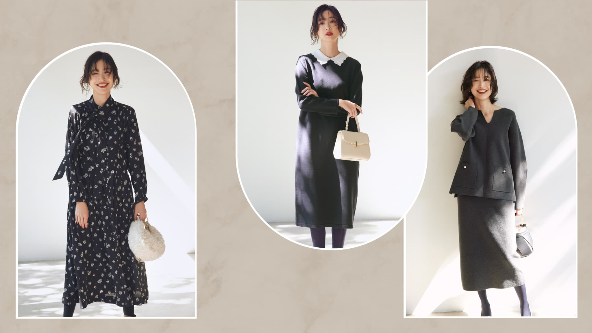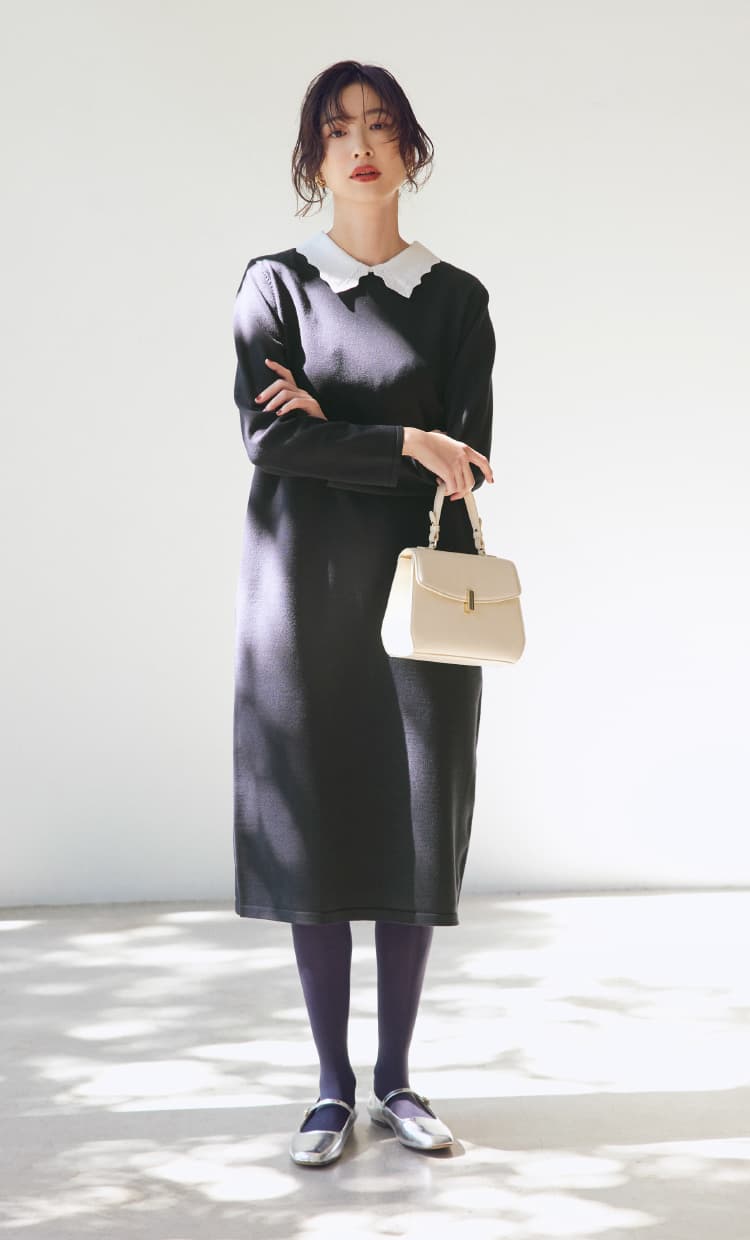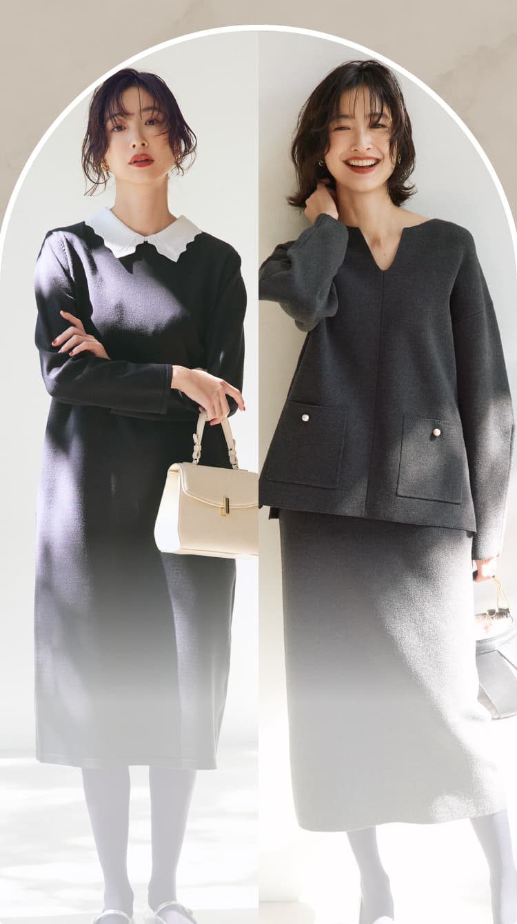 一枚ではもちろん、Tシャツやブラウスと重ねても決まりやすい襟のあき具合、すっきり見えつつタイトすぎないスカートのシルエットが秀逸。