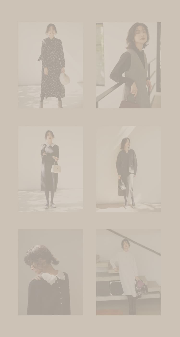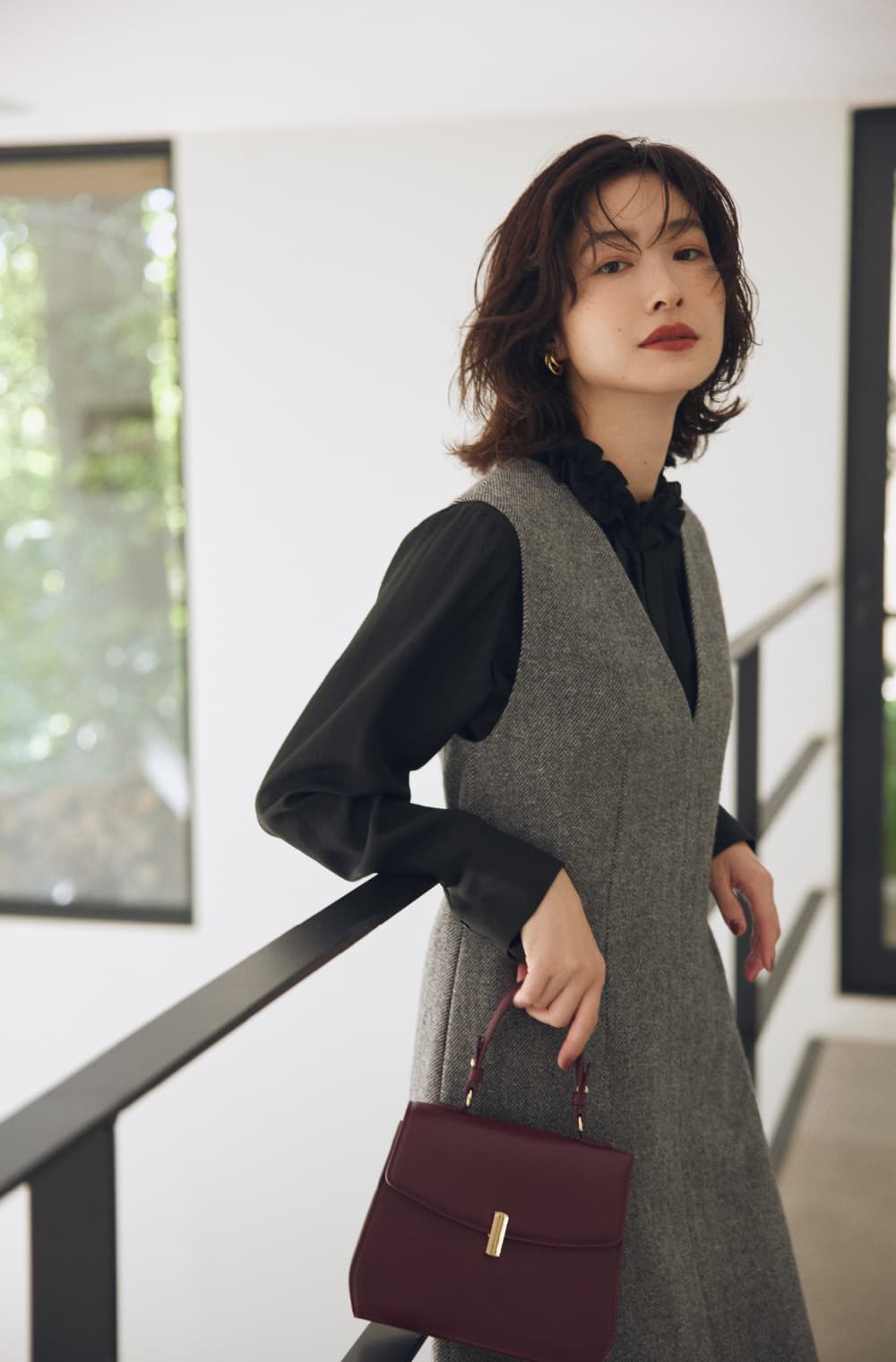 深めのVネックデザインが上半身をすっきりきれいに見せてくれ、インナー次第でイメージ自在、旬のレイヤードスタイルが楽しめる。モノトーンでまとめれば、凛とした華やかさが簡単に手に入る。