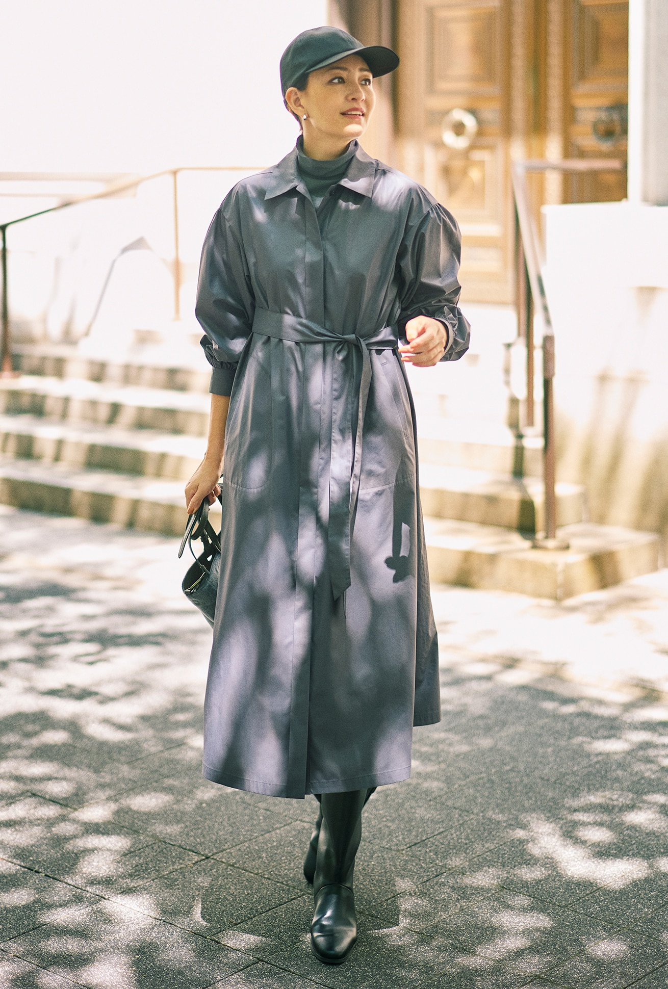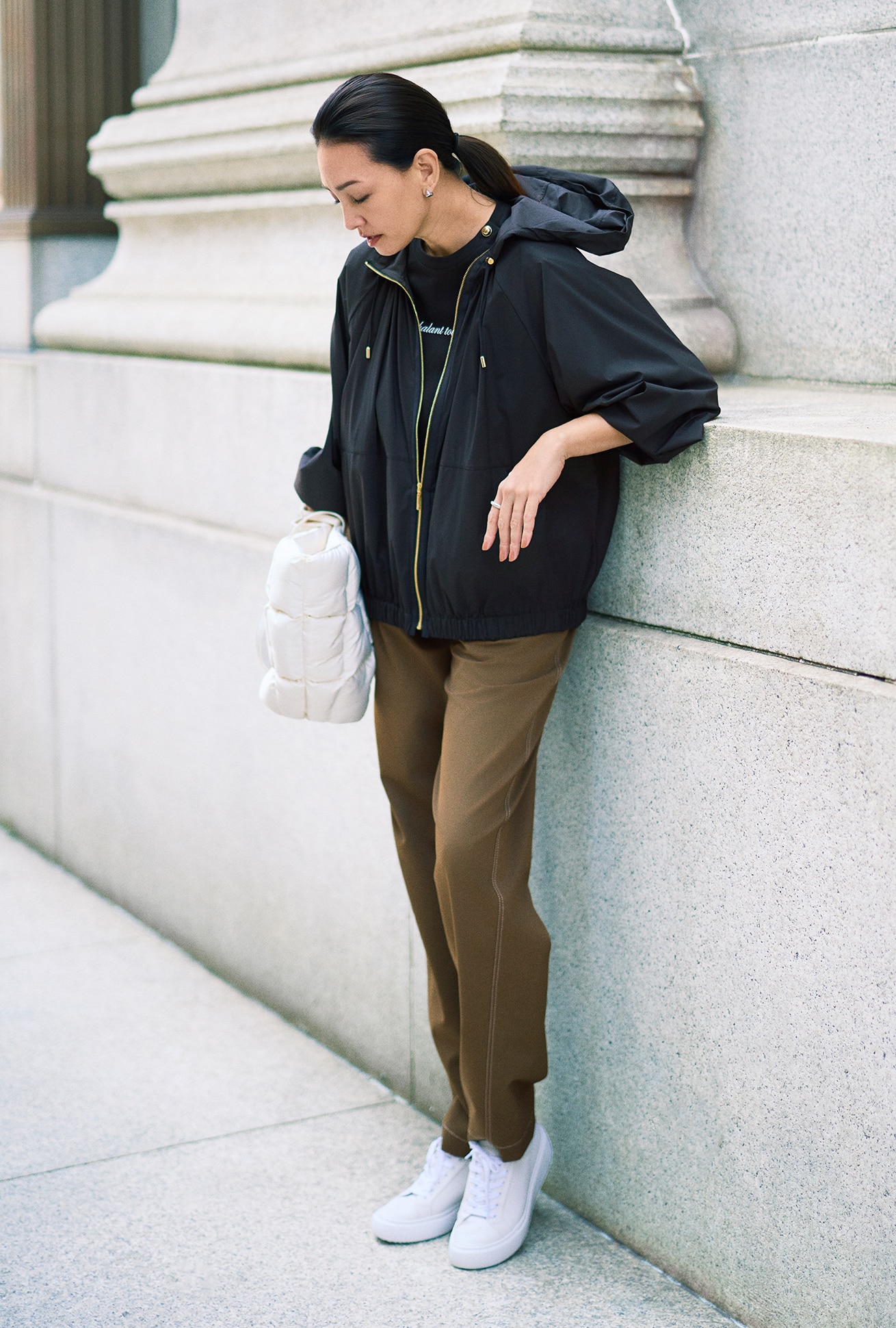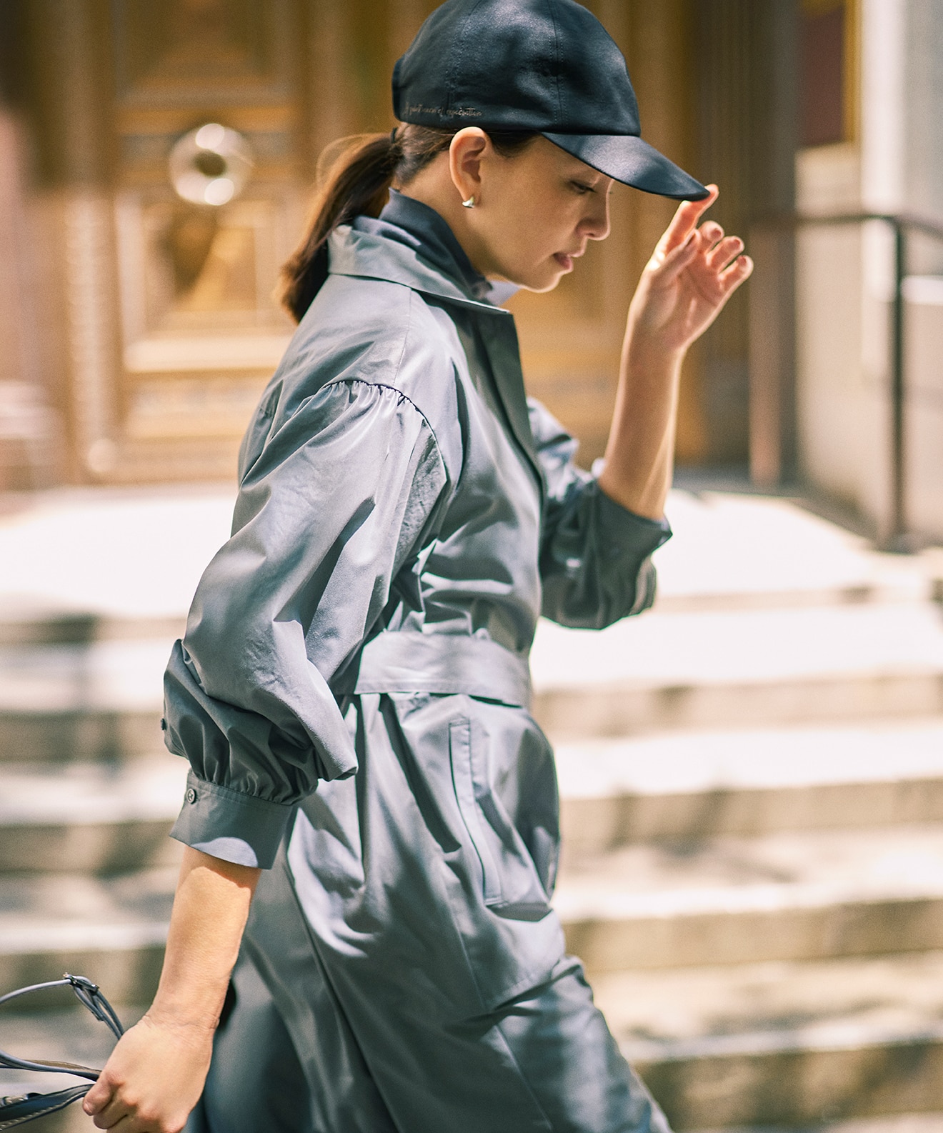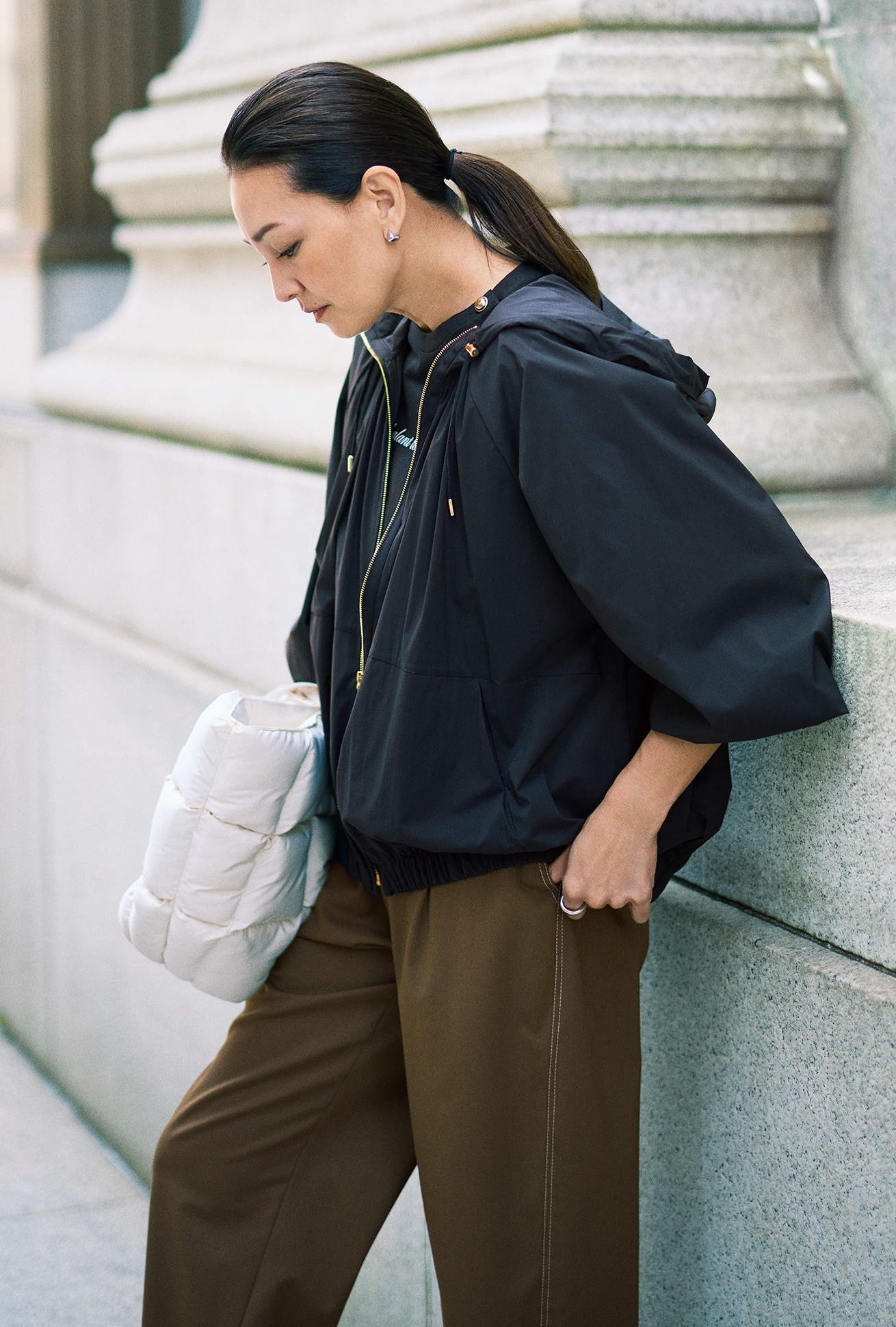 たっぷりと施したギャザーによる、丸みを帯びたシルエットが印象的なナイロンブルゾン。さらに女らしさに一役買っているのが、フロントで繊細に輝くゴールドファスナー。モバイルできる同素材の袋付きで、撥水加工入り、水洗いも可能という機能面も申し分なし。