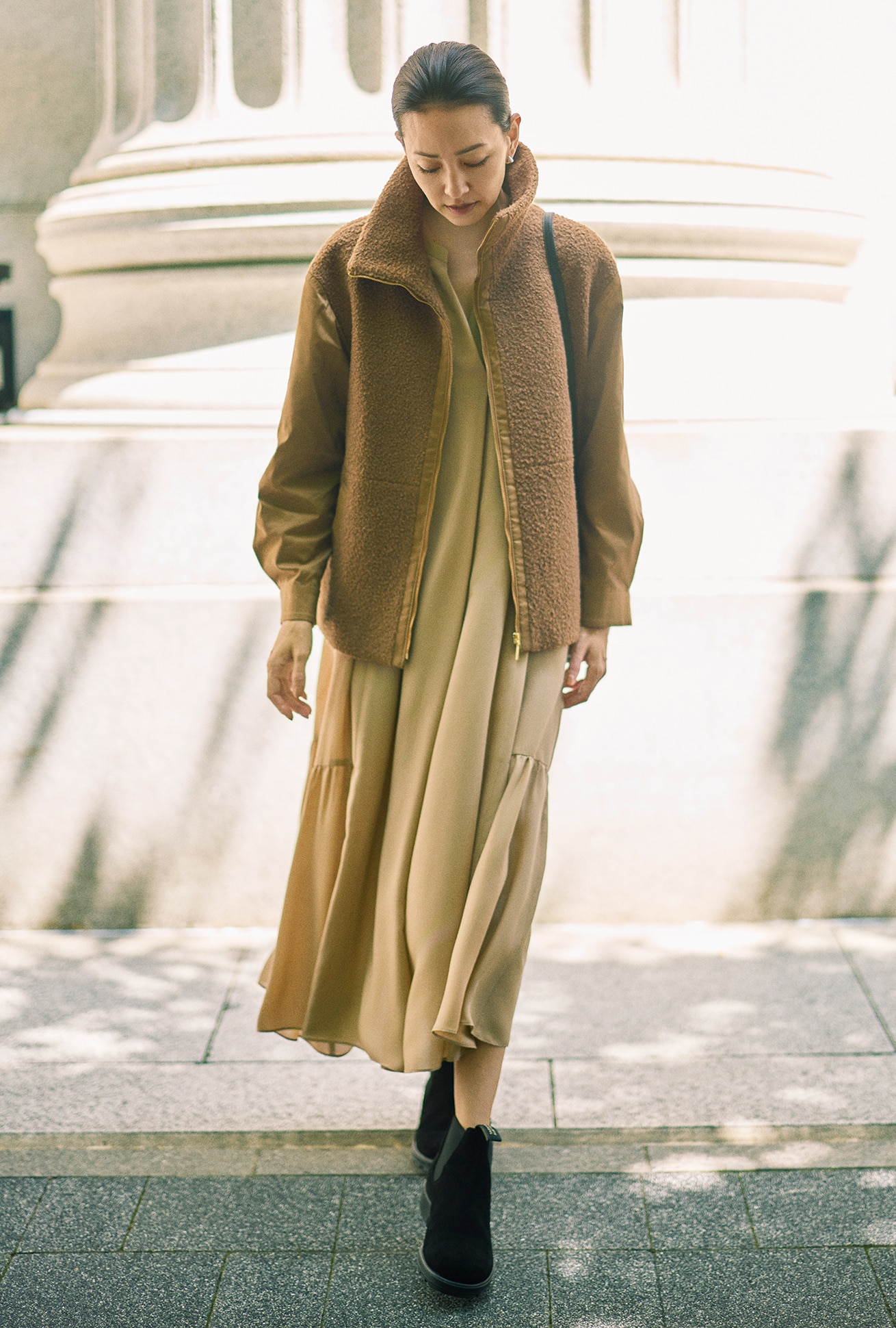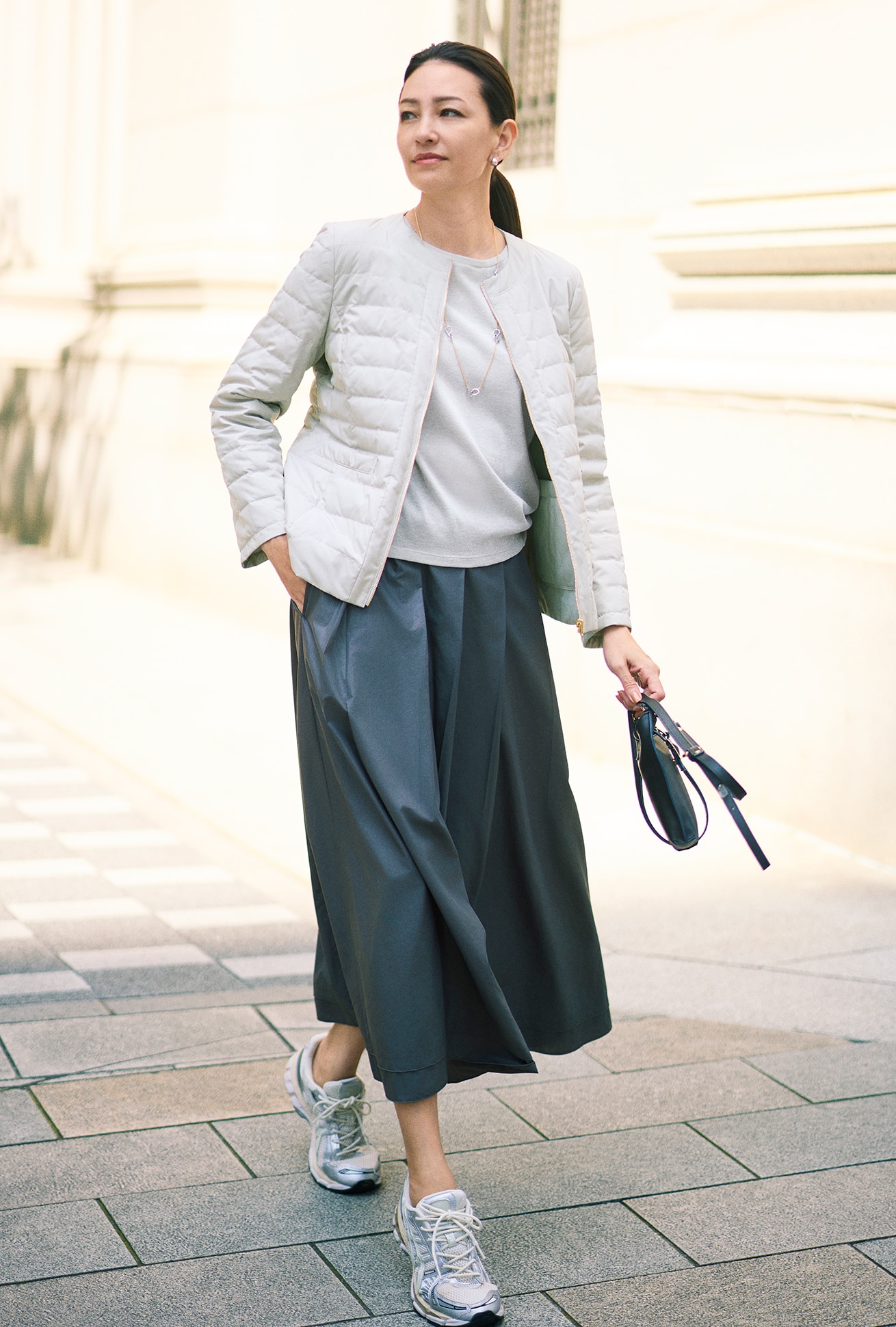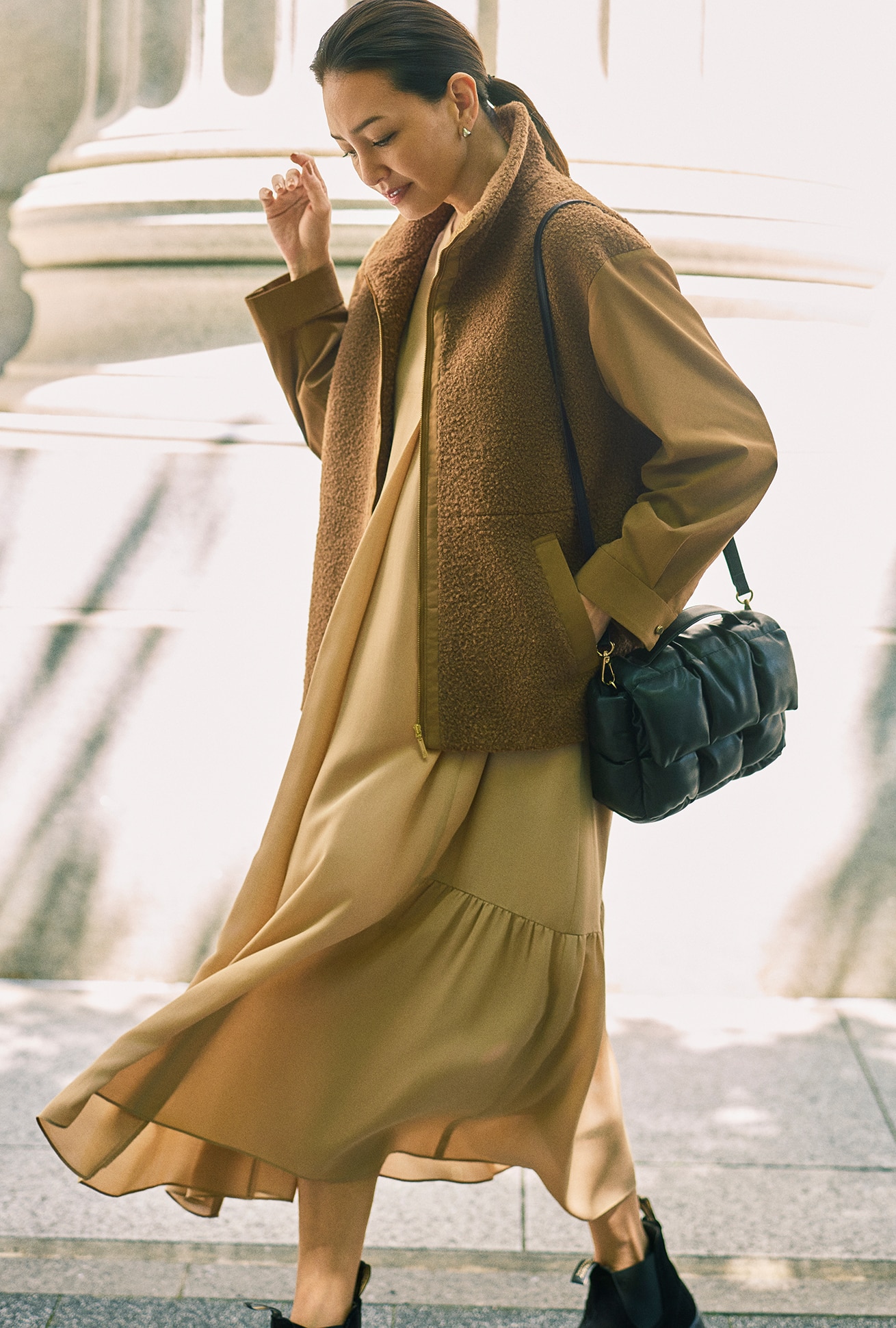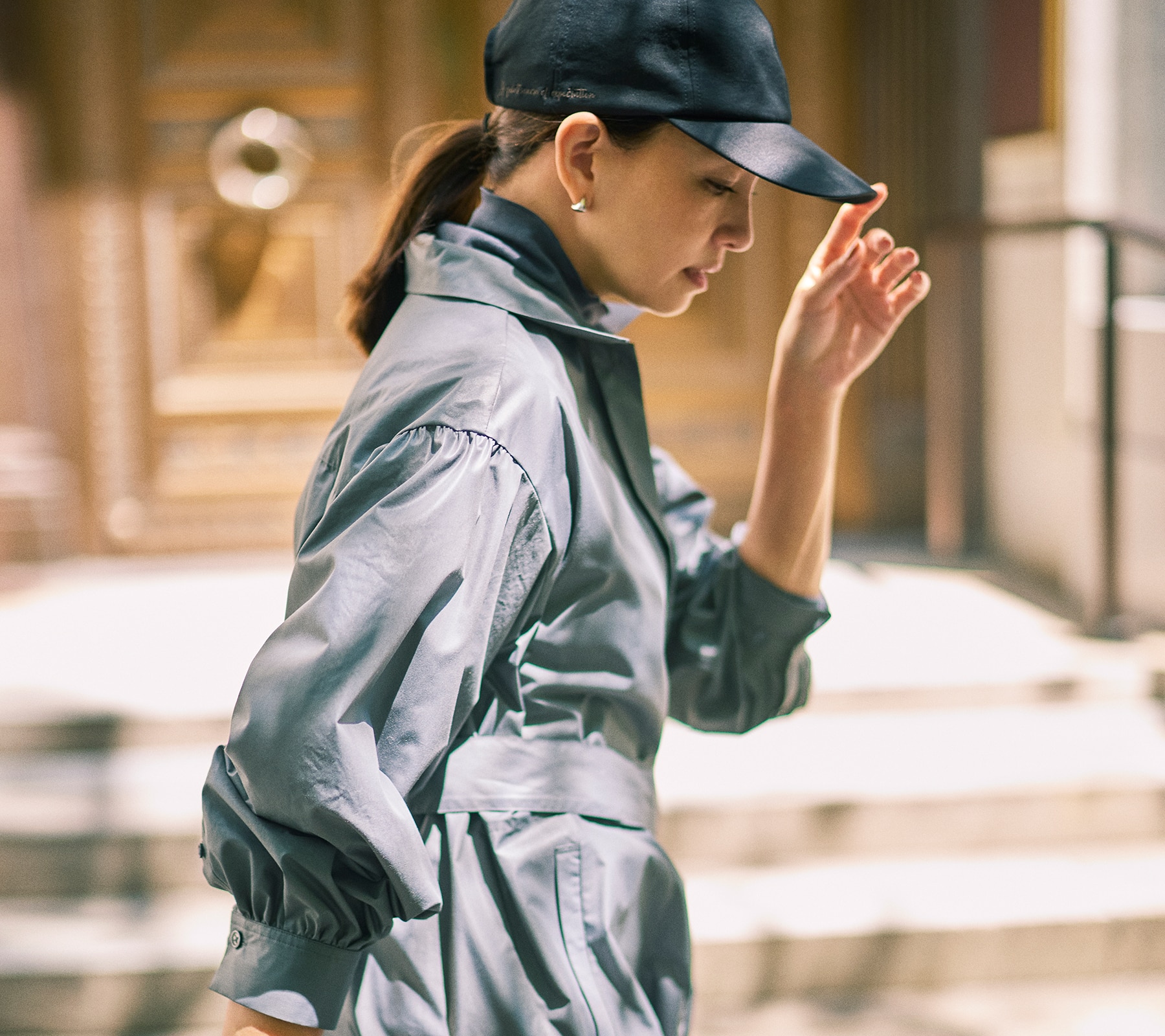 たっぷりと施したギャザーによる、丸みを帯びたシルエットが印象的なナイロンブルゾン。さらに女らしさに一役買っているのが、フロントで繊細に輝くゴールドファスナー。モバイルできる同素材の袋付きで、撥水加工入り、水洗いも可能という機能面も申し分なし。