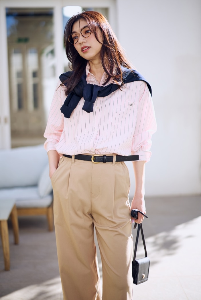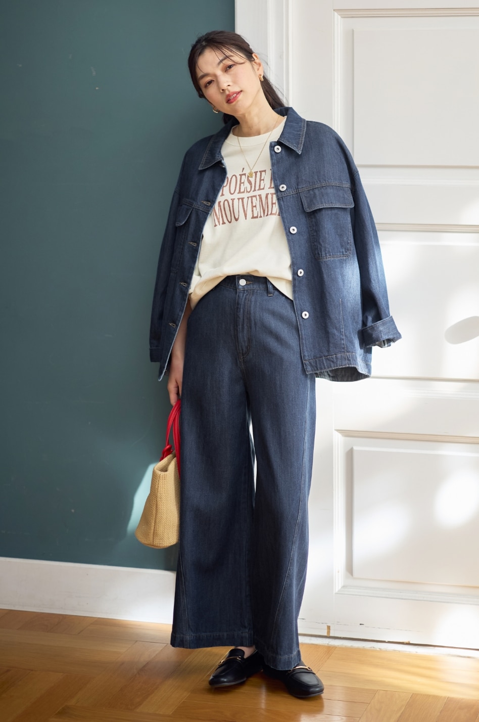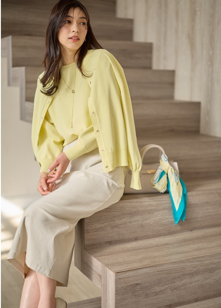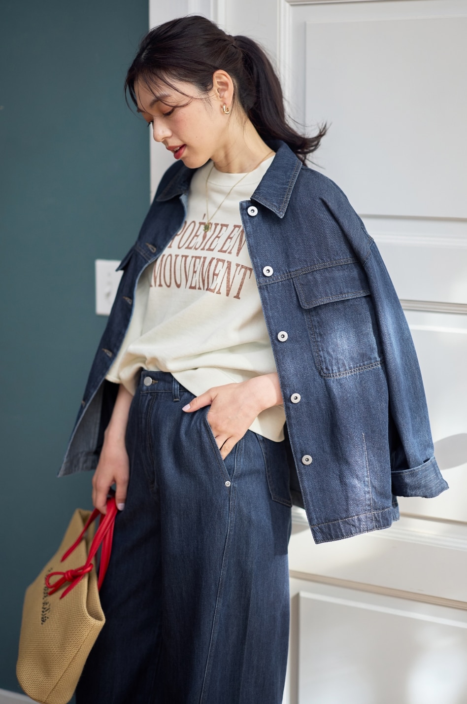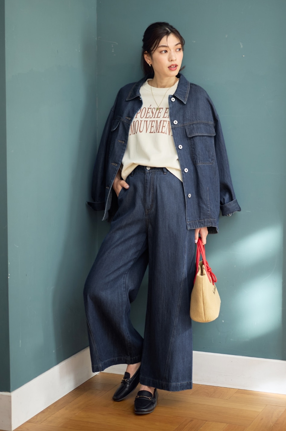 柔らかく落ち感のある素材なので気負わない、こなれLOOKが完成。ややオーバーサイズのジャケットは衿を抜いて羽織ればレディライクな印象に。バランスのよい縦長シルエットをつくるパンツは、どんなトップスともマッチするオールマイティさ。