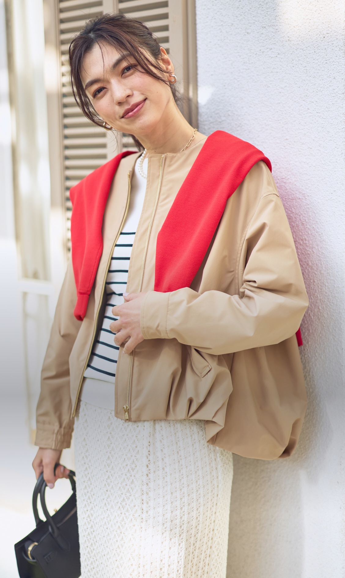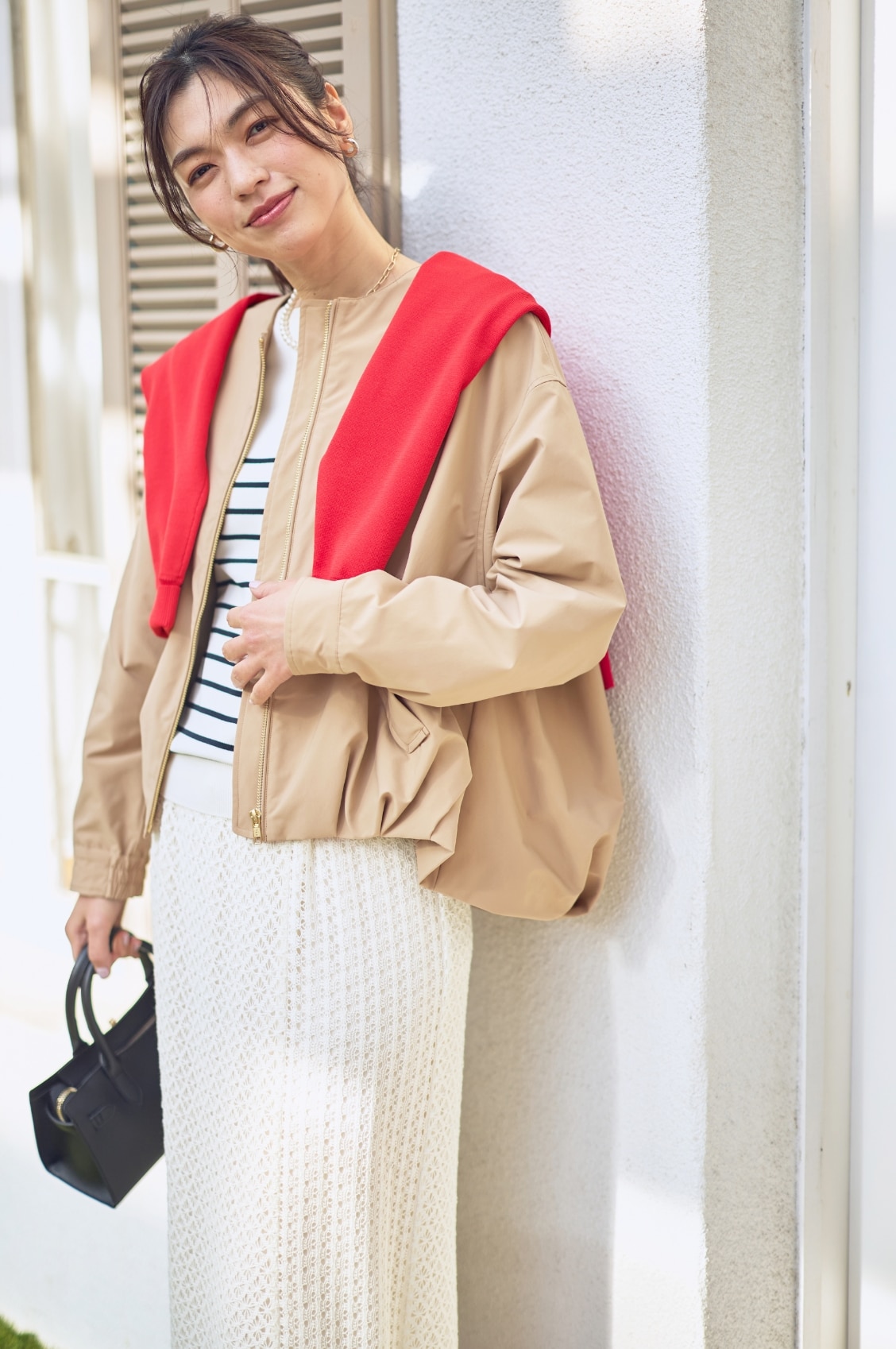 ふんわりと広がるバルーンデザインで、メンズライクになりがちなブルゾンコーデに上品さをひとさじ。撥水加工やUVカット効果でアクティブなシーンにも頼りになります。Iラインのスカートでメリハリをつけてスタイルアップ効果も期待。