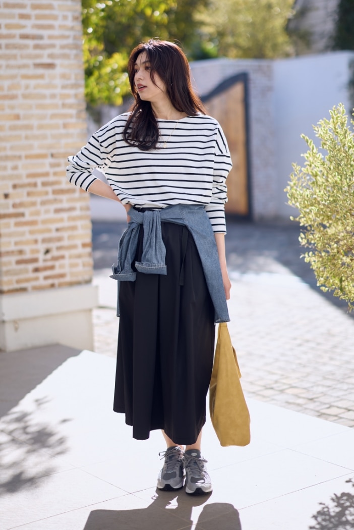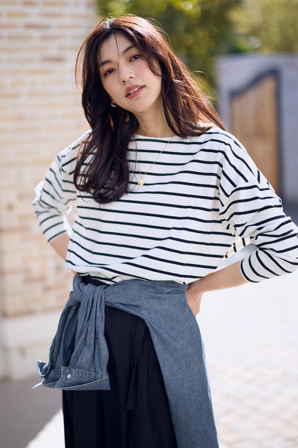 一枚でも無難に見えない、今っぽいバランスに仕上げてくれるコクーンシルエットのボーダートップス。計算された絶妙な丈感は着回し力も◎。カラー展開も豊富なので、2枚買いしてクローゼットに常備しておきたい存在です。