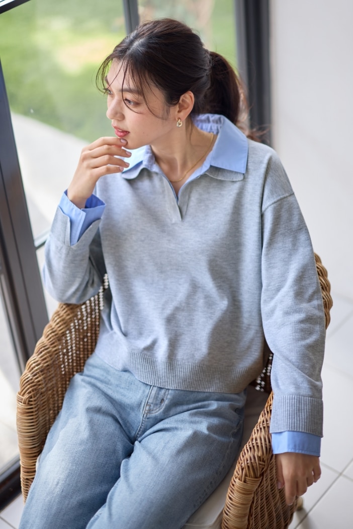 コットンのようなさらりとした肌触りのニットは、V字の胸元で顔周りもすっきり。まるでシャツを重ねたようなデザインは、手持ちのデニムと合わせても新鮮に見せてくれます。淡いグレー×水色のアイシートーンの組み合わせで軽やかな装いに。