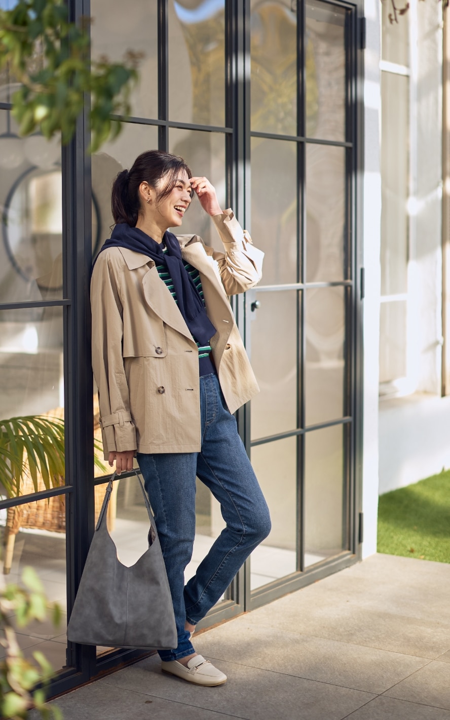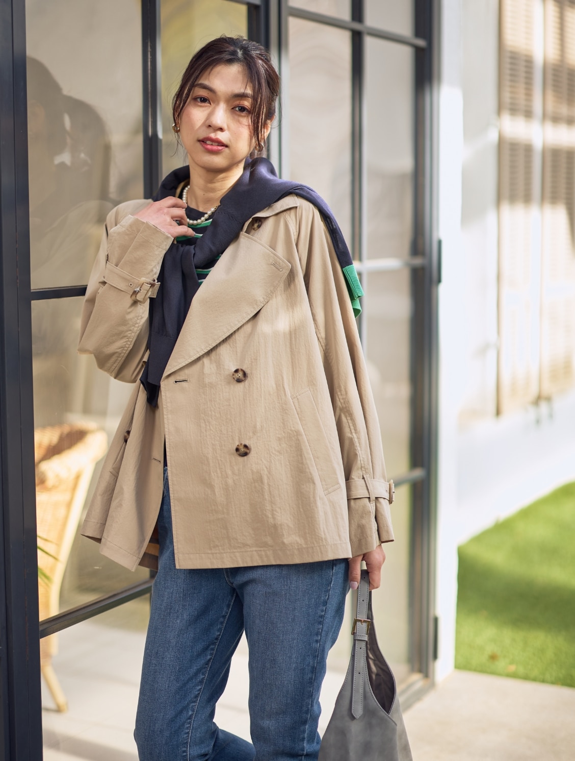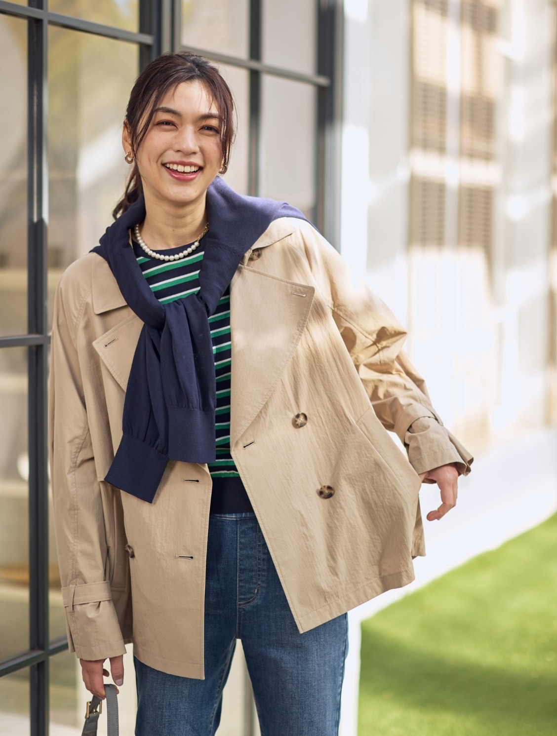 トレンチならではのきちんと感は残しつつ、軽い素材感とややゆとりのあるシルエットでデイリーから通勤、ちょっとしたシーンまで出番多め。シワが目立ちにくく、自宅で洗濯可能なので毎日でも着られる頼もしさ!