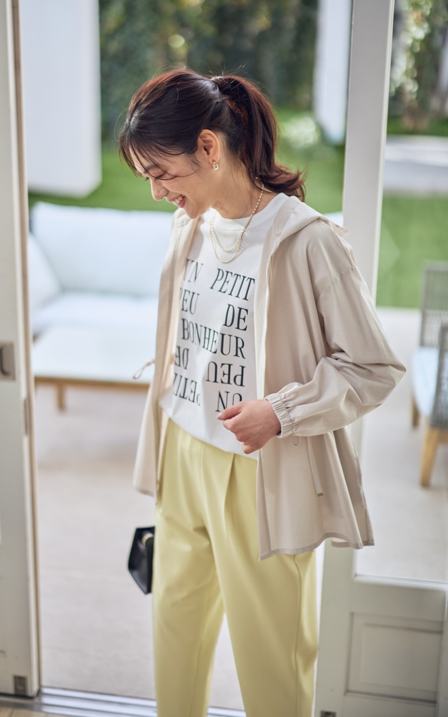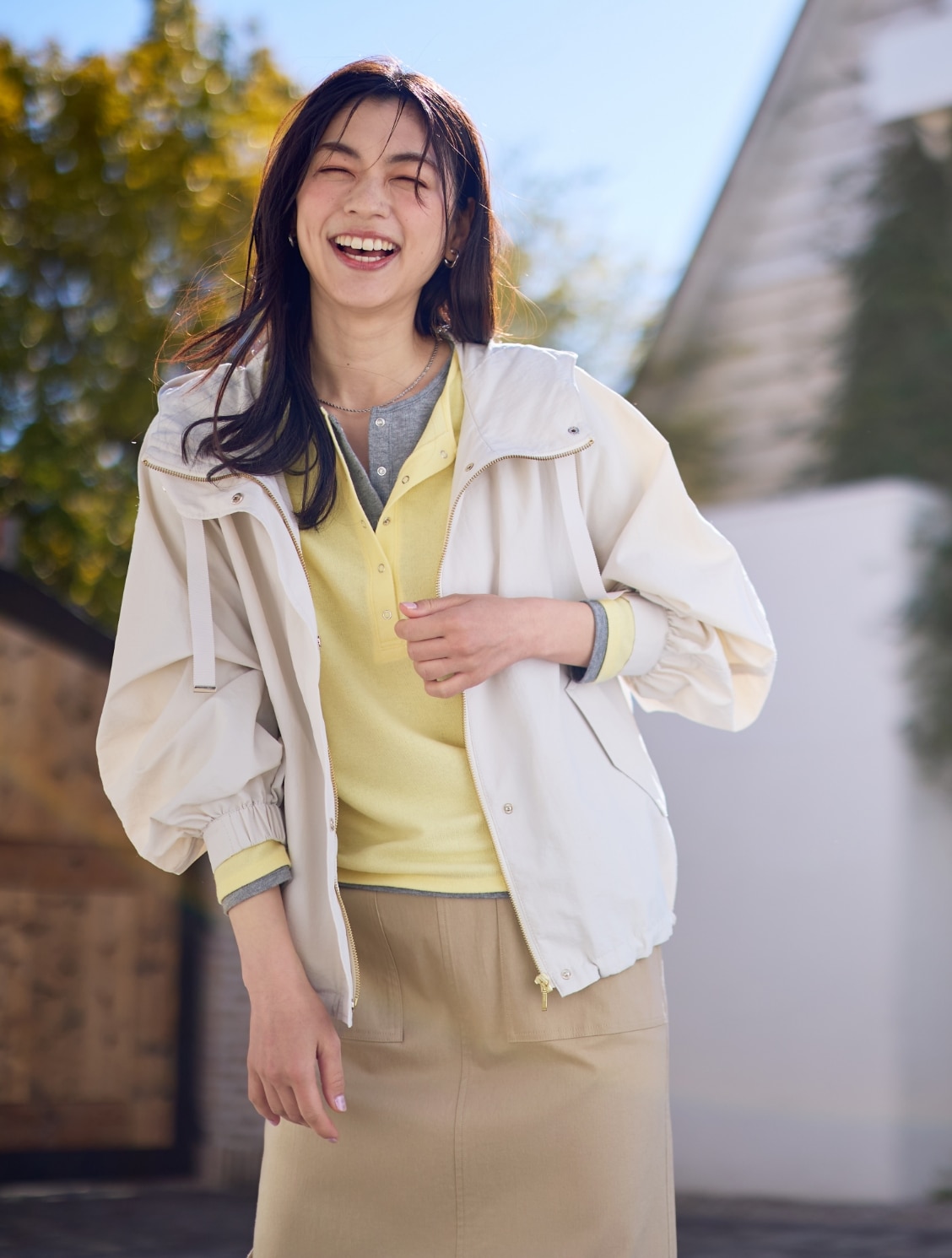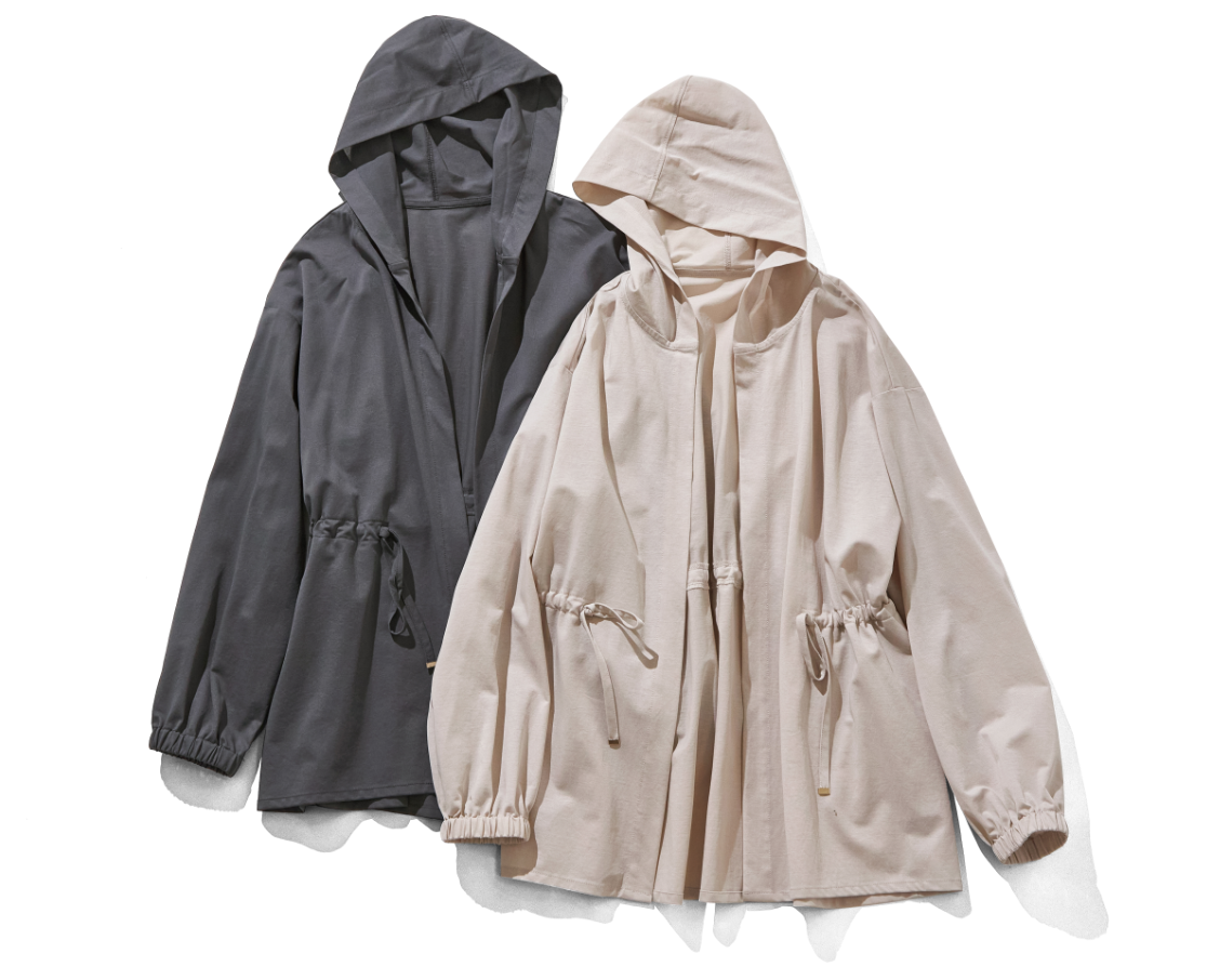 ウエストを絞れるドロストや、お尻が隠れる丈感など、バランスよく着こなせるこだわりが満載。程よいシアー感とハリ素材で手抜きに見えない工夫を施し、きちんと感もキープ。UVケア付き&マシンウォッシュ◎なので、犬のお散歩などにもぴったりです。