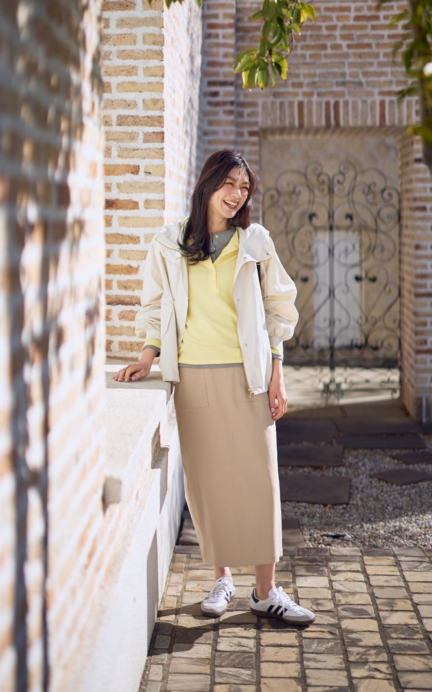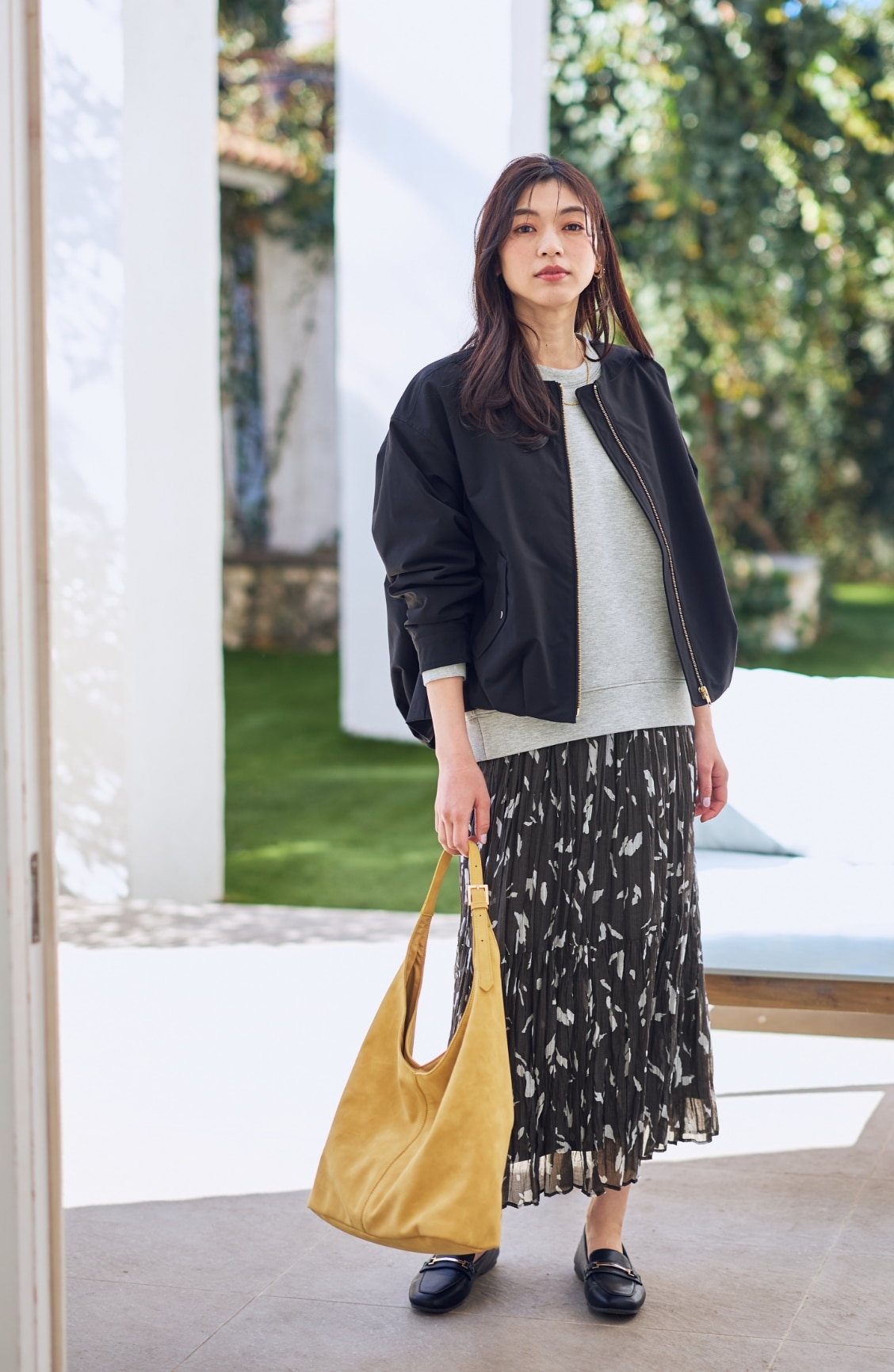 ボリュームのある裾のデザインでさりげなくヒップラインをカバーしながら、ほんのり大人の可愛げを。縦長ラインのスカートと合わせてメリハリを効かせれば、さらにスタイル美人に。華かさのある大人のスポーティスタイルが新鮮です。