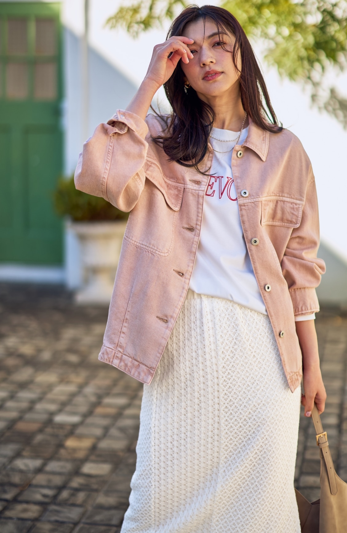 落ち感のある柔らかな素材と、オーバーサイズで旬にアップデートしたデニムジャケット。淡いピンクとレーススカートでほんのり甘さを効かせて脱・無難に。少し襟を抜いて着れば、洗練されたムードを引き寄せてラフ見えを回避。