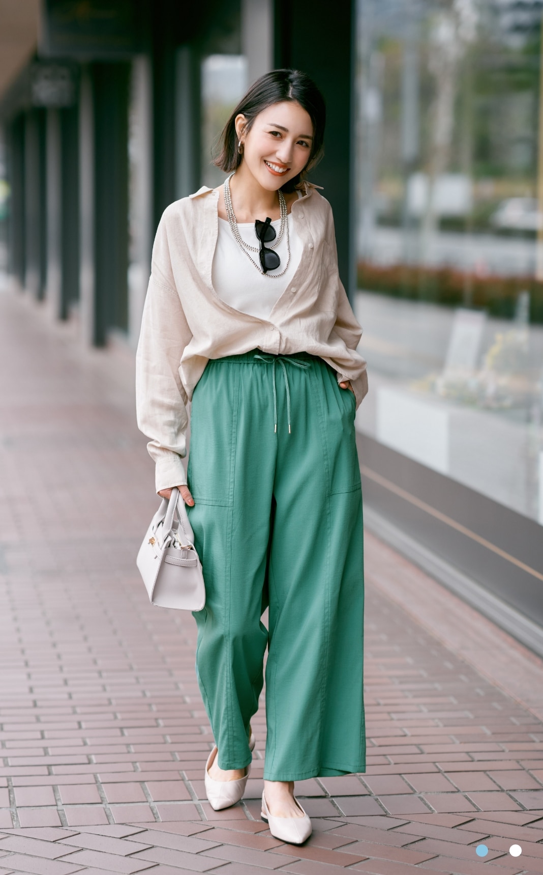 ベージュは何にでも合わせやすいので、パンツに色を持ってきて旬のムードを足しました。少し襟を抜いて、肩やデコルテあたりの肌をのぞかせることで上品に着映え。ボトム次第でアレンジ自在なのがベージュシャツの魅力です。