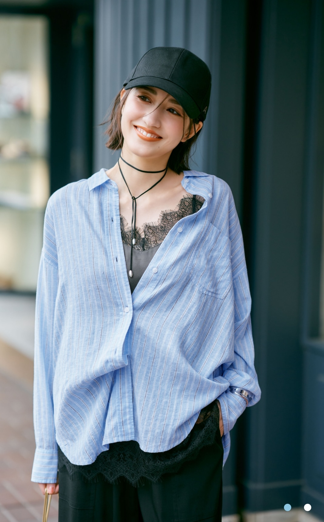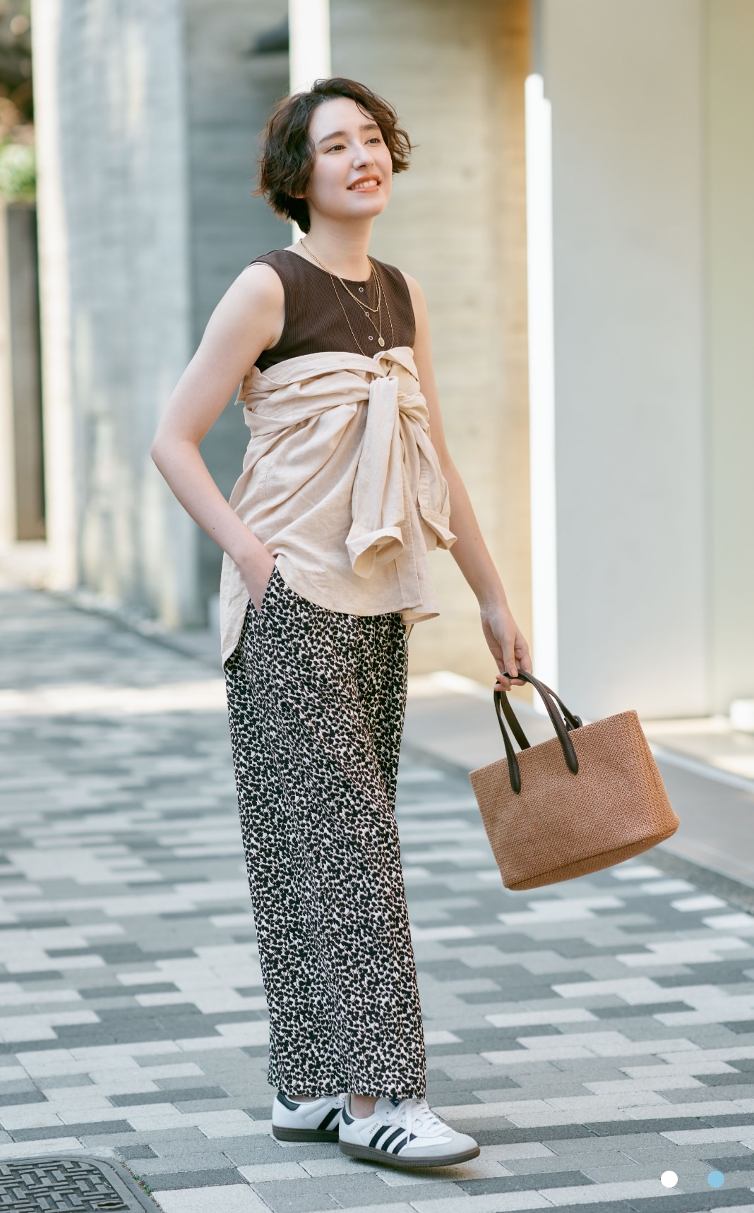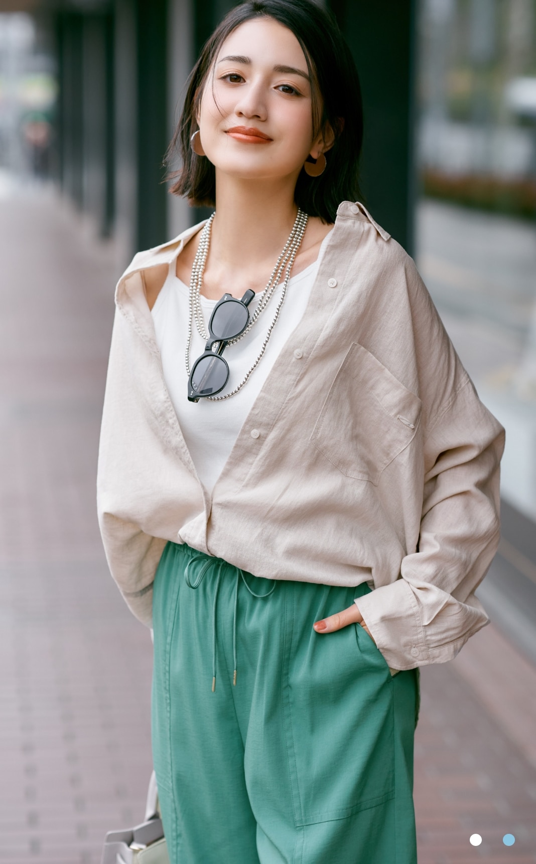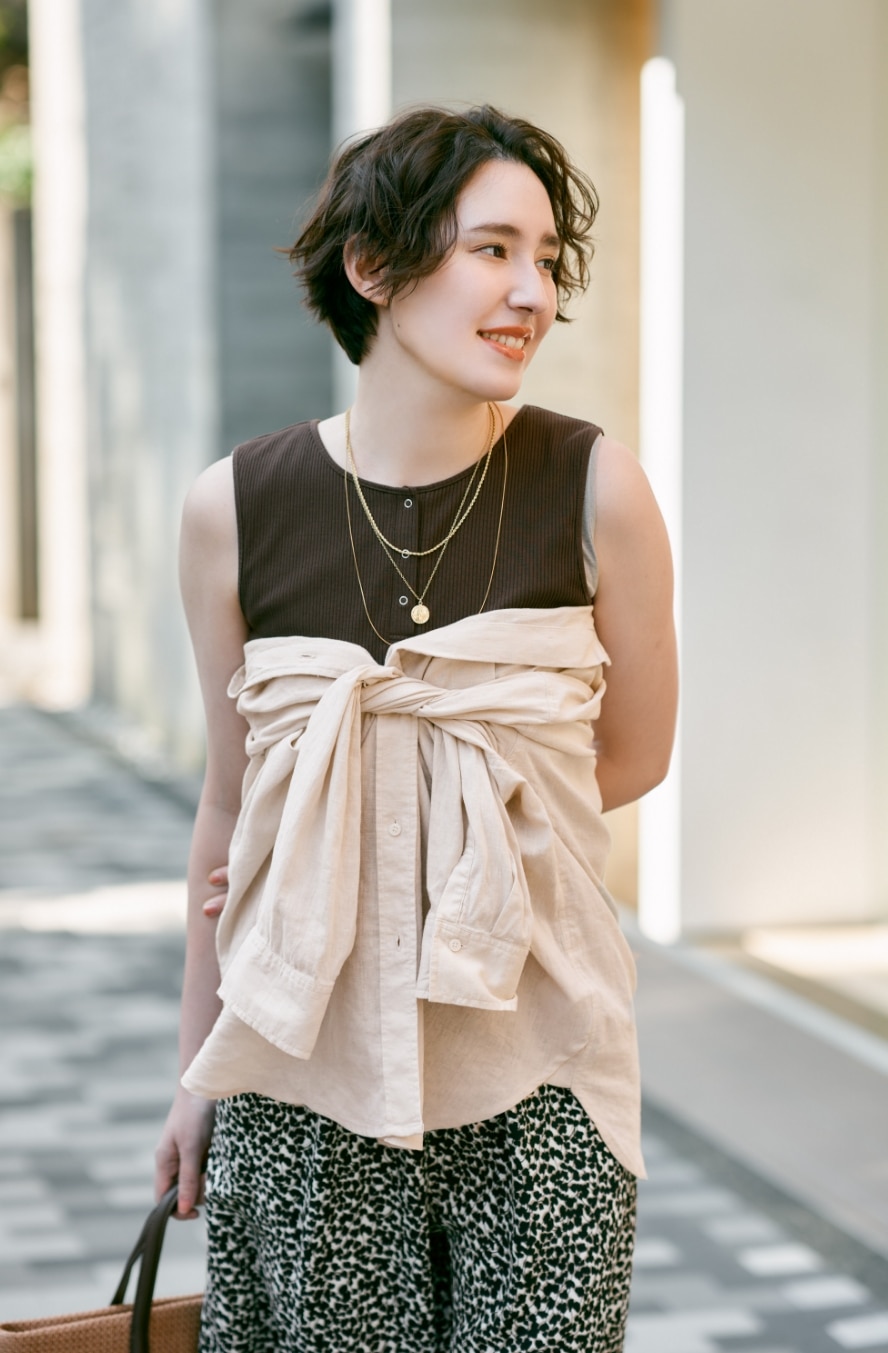 この夏にぜひ挑戦してほしいのがこのビスチェ巻き。即今っぽさが出せて、コーデがマンネリしたときにも活躍します。柔らかいリネン素材のシャツは羽織ったり巻いたり、アレンジがしやすいのでいろいろな着方を楽しんでほしいです。