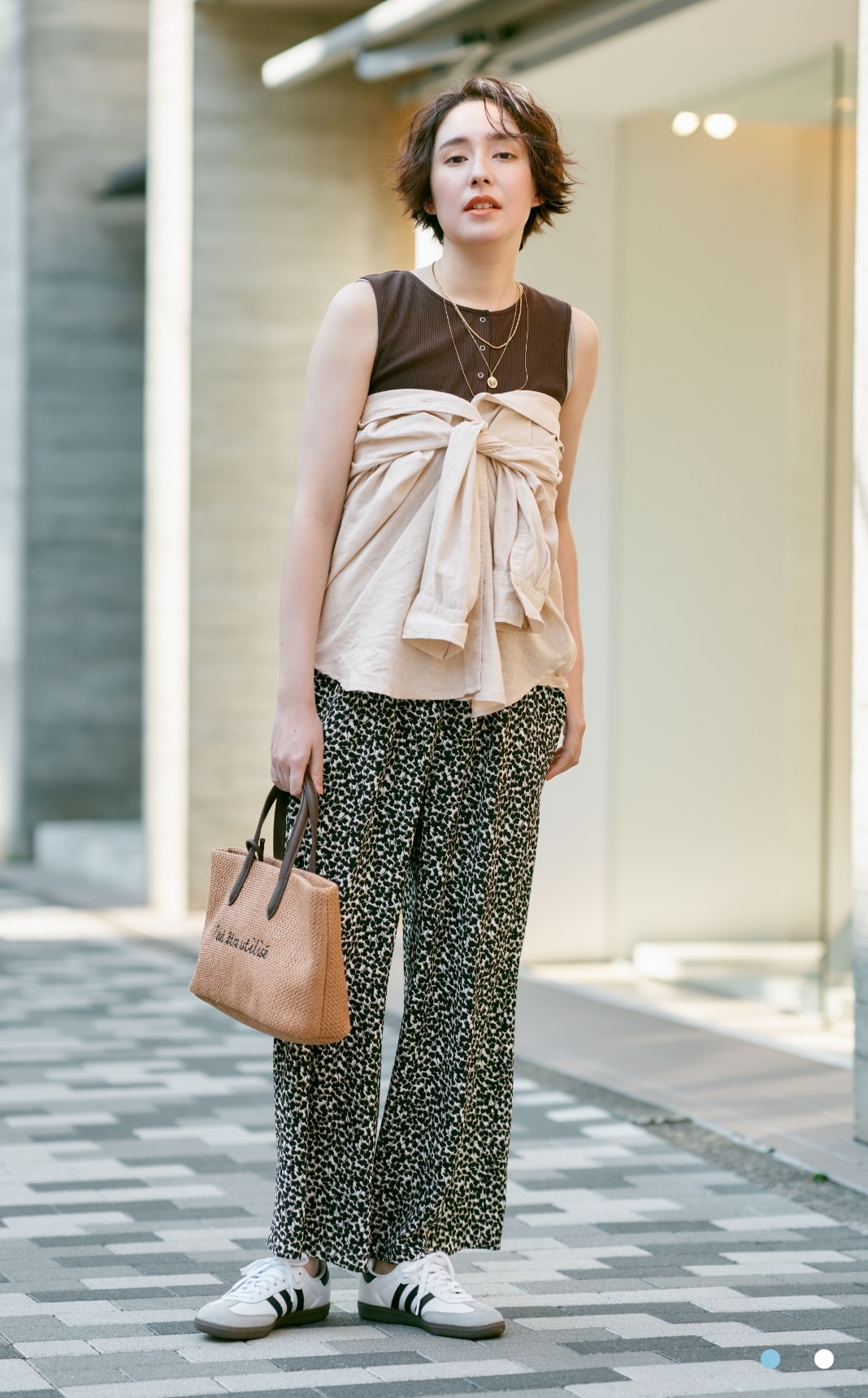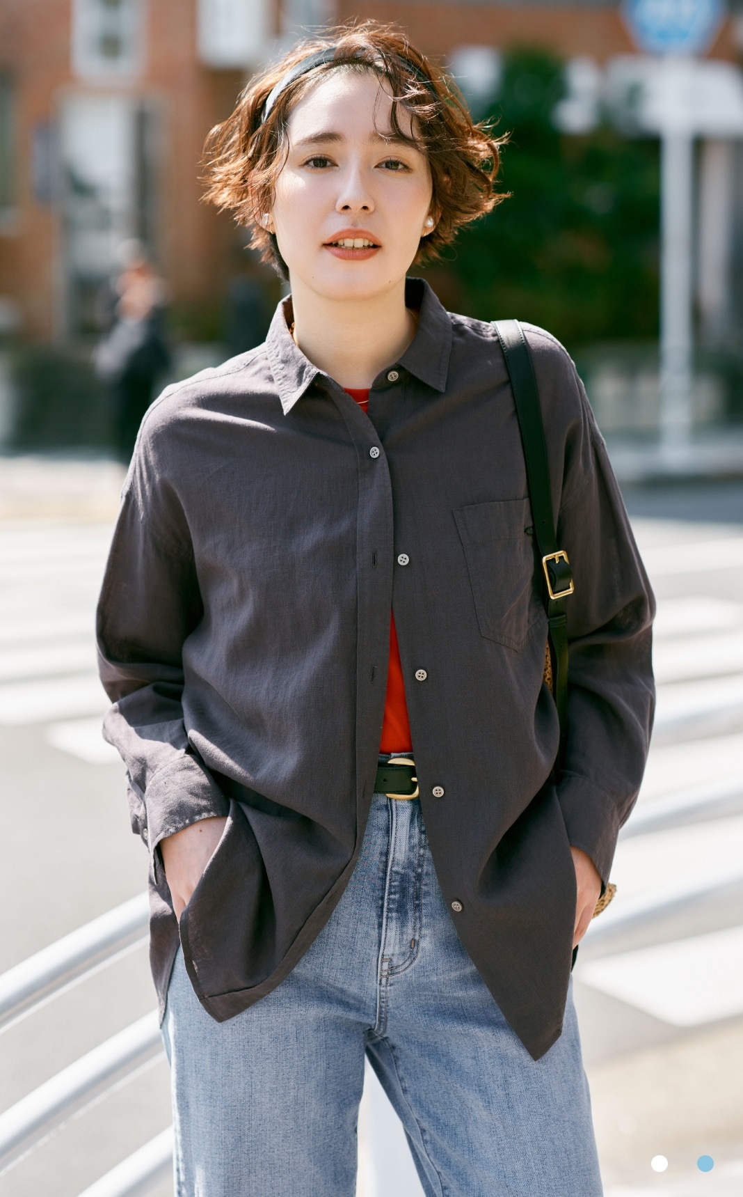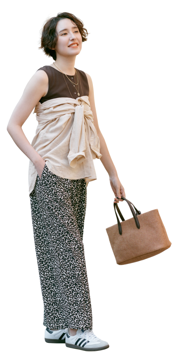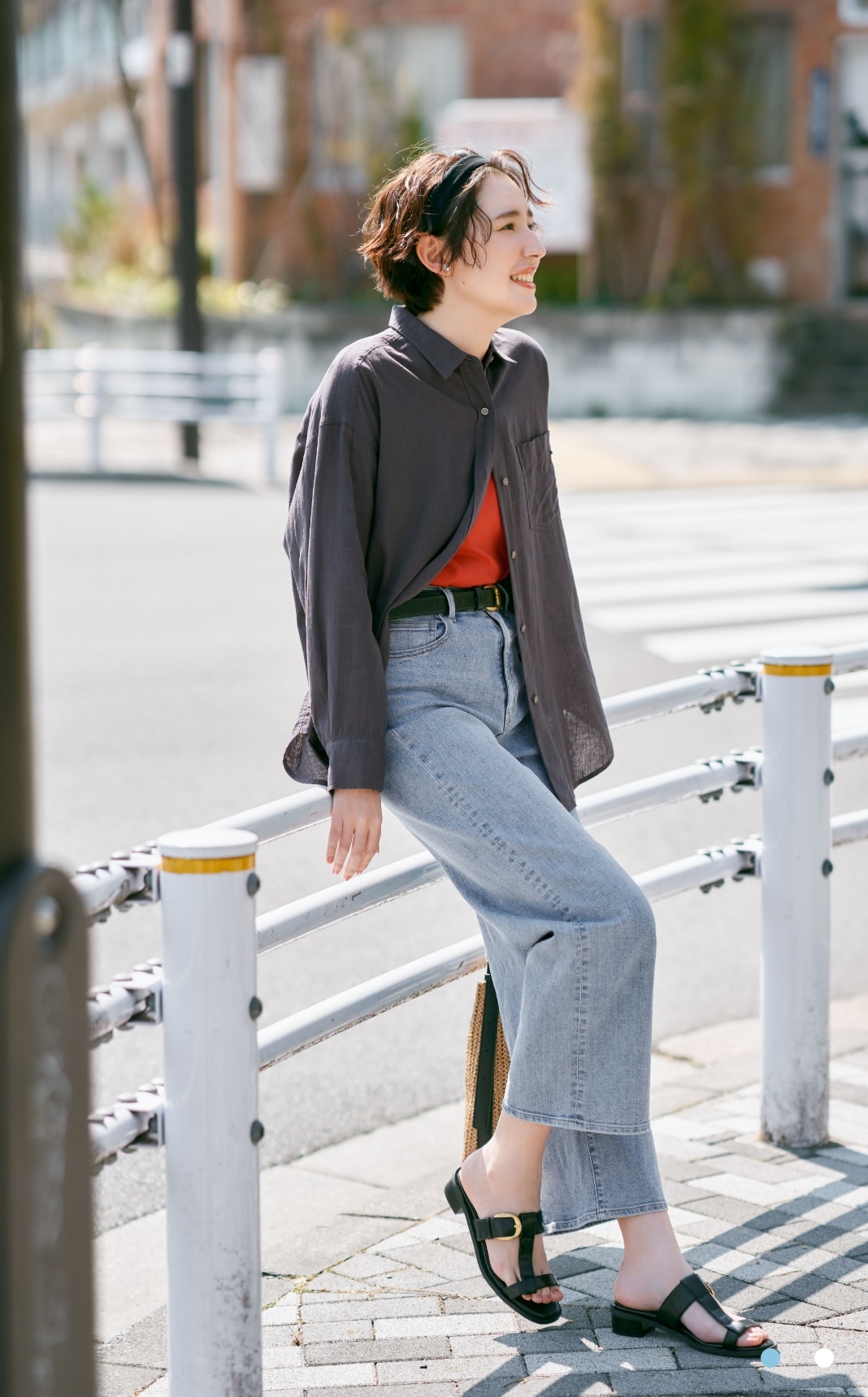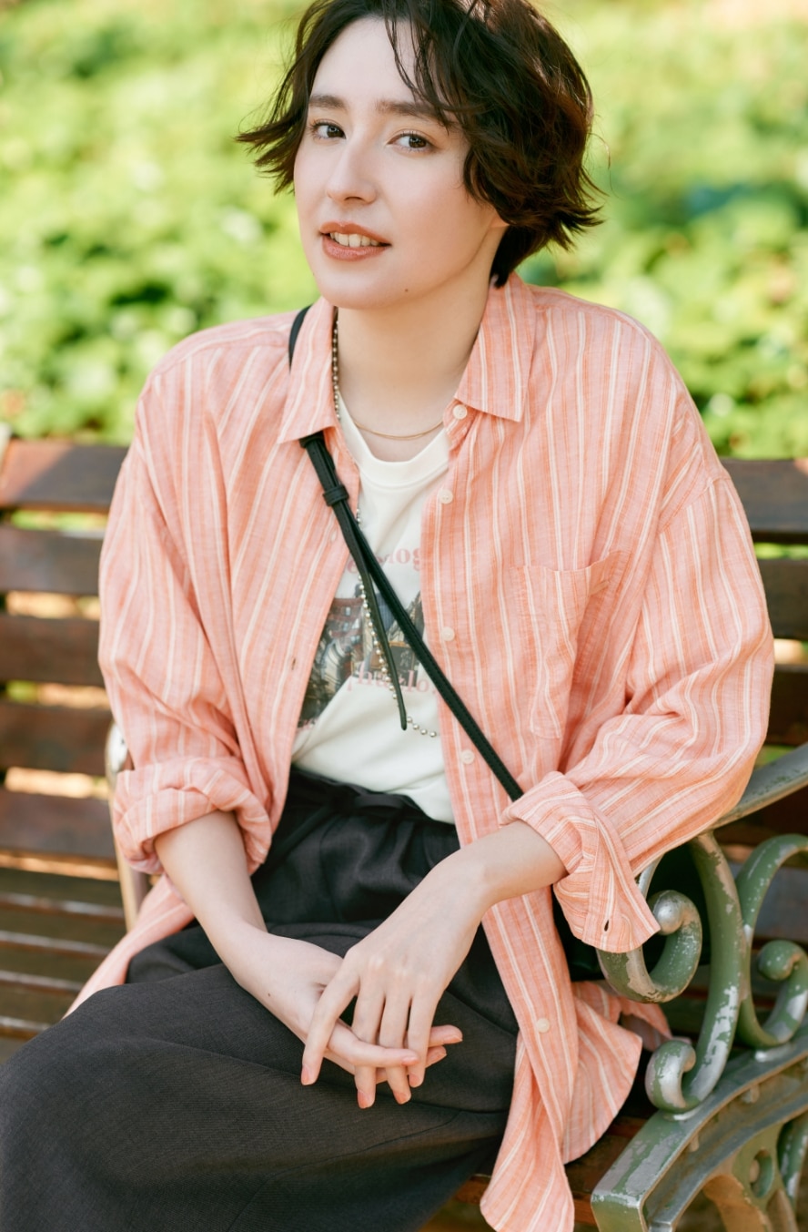 この夏にぜひ挑戦してほしいのがこのビスチェ巻き。即今っぽさが出せて、コーデがマンネリしたときにも活躍します。柔らかいリネン素材のシャツは羽織ったり巻いたり、アレンジがしやすいのでいろいろな着方を楽しんでほしいです。