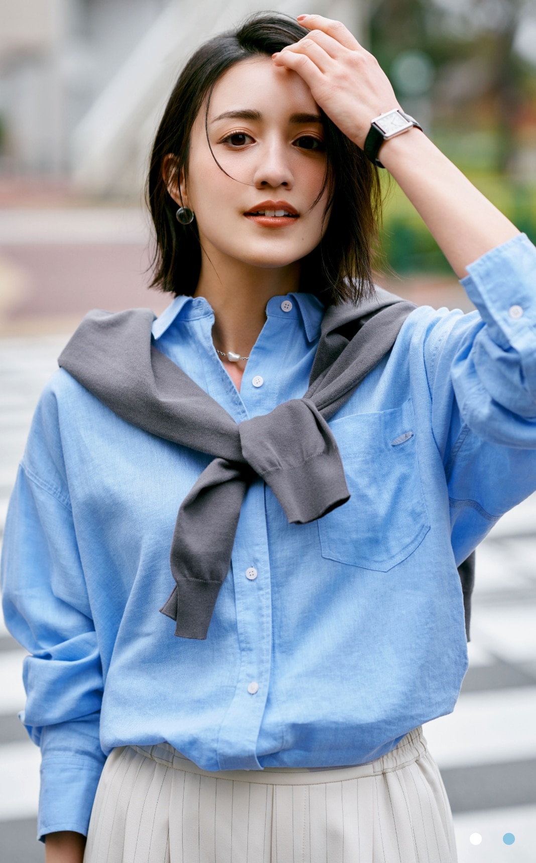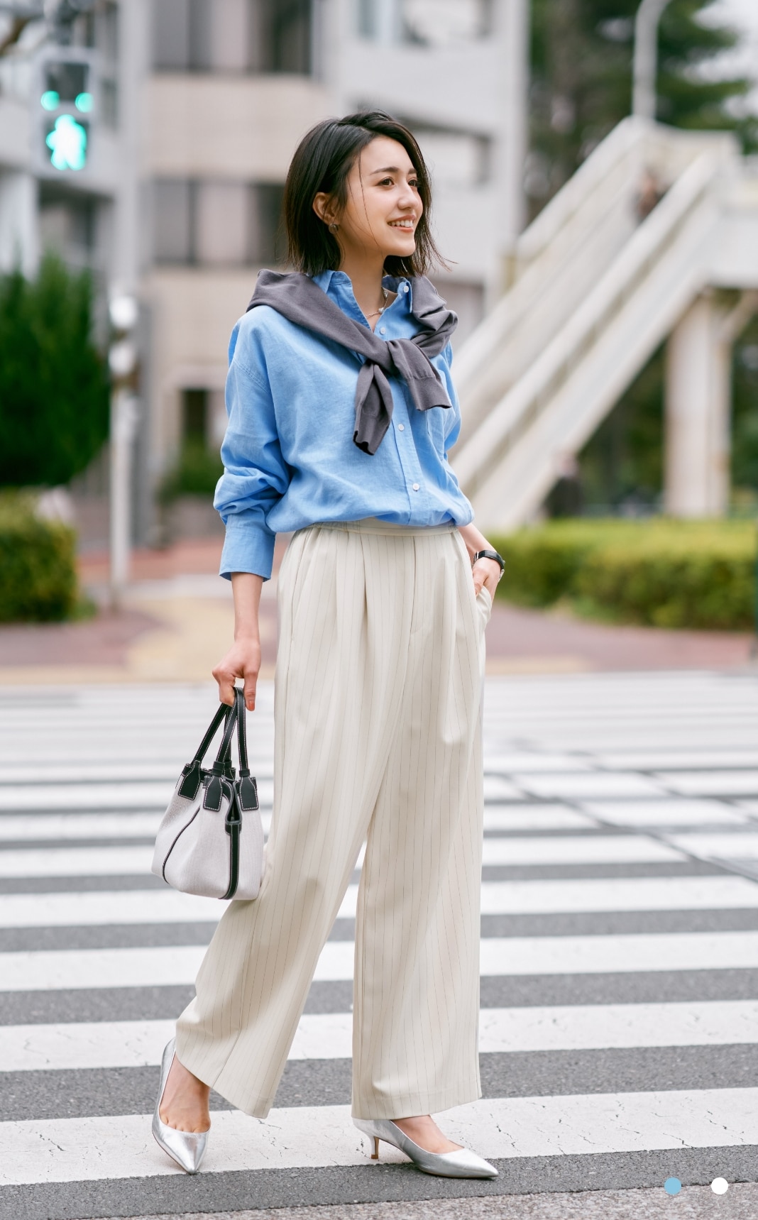 オンにもオフにも、ブルーのシャツは一枚持っておきたい存在です。色が薄すぎると顔がくすんで見えてしまうので、これくらいの色味が大人にぴったり。白のパンツとコントラストをつけてきりっと仕上げました。