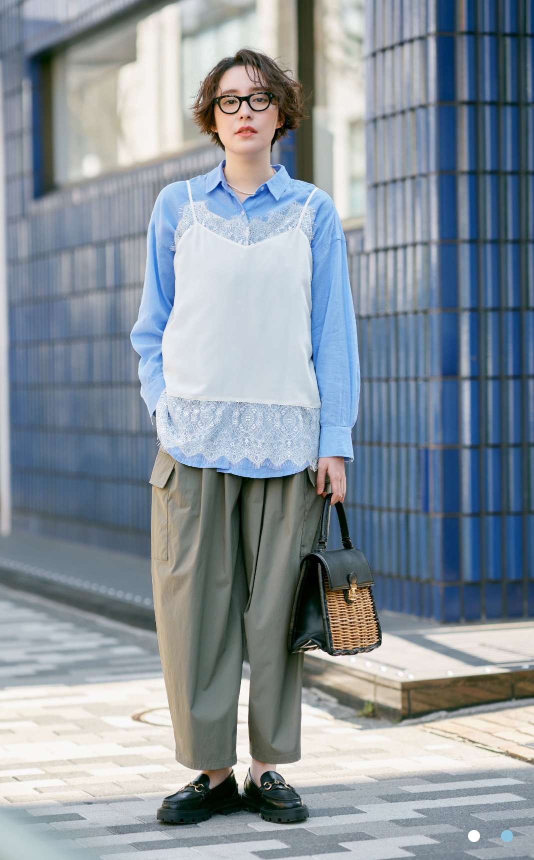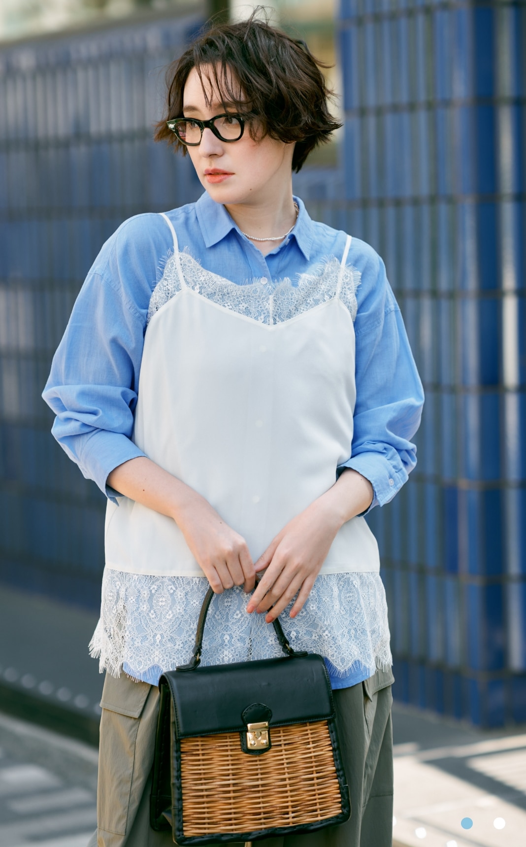 今季、トレンドのレースをシャツの上から重ねました。ガーリーな印象にならないように、ボーイッシュなパンツやメガネなど、あえて真逆のテイストを合わせるのがコツ。こうした引き算で程よく上品なムードが漂います。