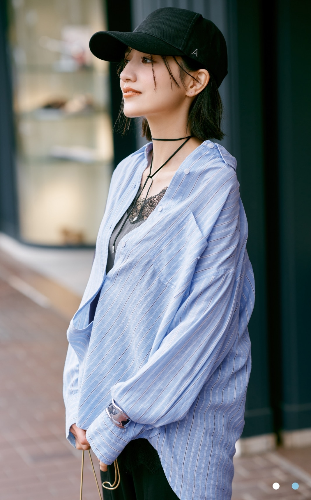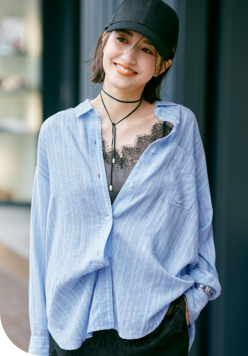 私自身、ストライプのシャツが大好きでこういった恰好をよくします。大きめのTシャツだと、だらしなく見えがちなので、シャツでウエストマークすることでくびれを演出。さらにアクセサリーを飾って大人の品を添えました。