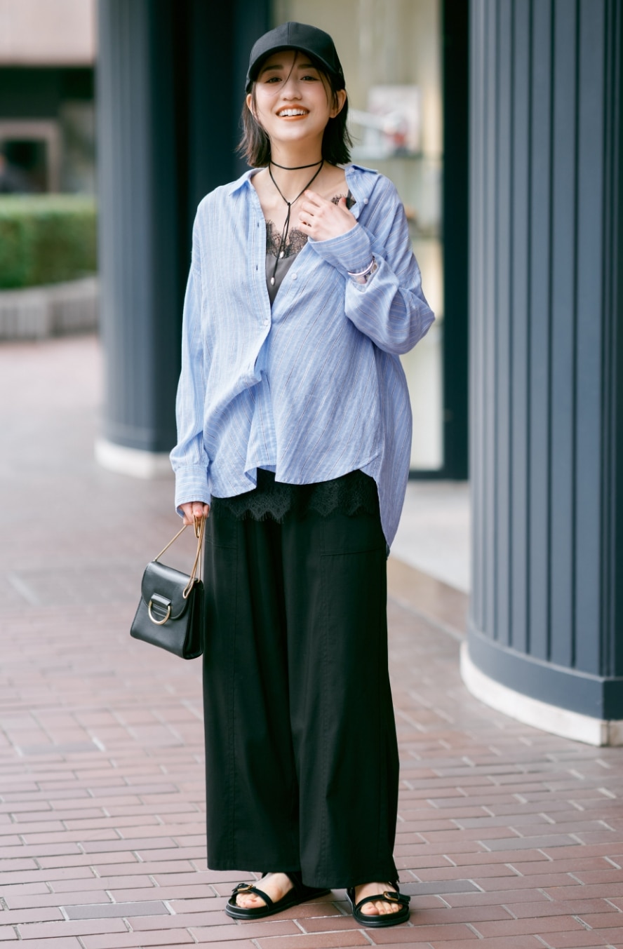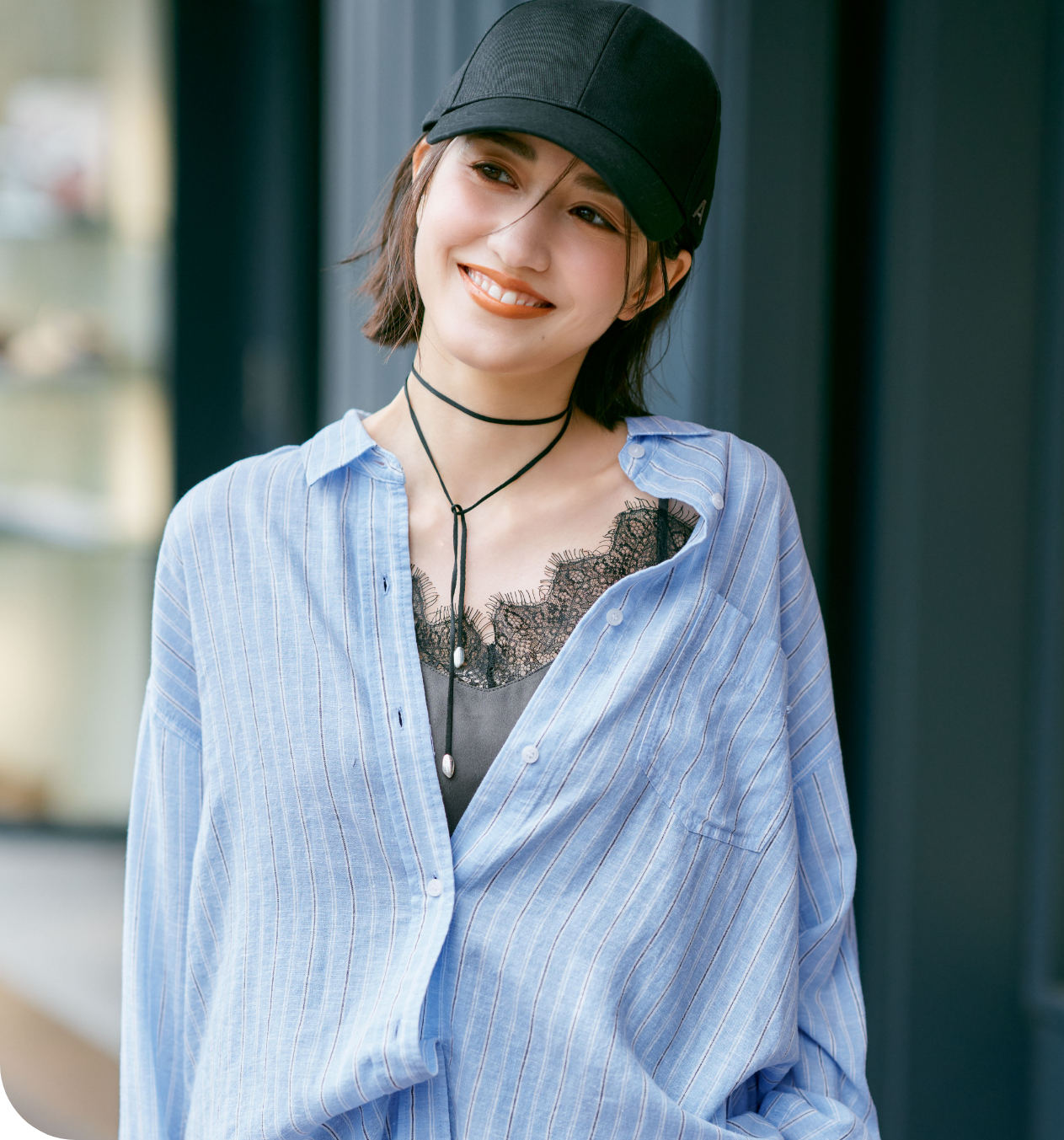 どこか真面目な印象があるストライプのシャツは、ボタンをわざと掛け違えて脱・無難に。そうすることでシャツのウエスト位置が上がり、スタイルアップも叶います。仕上げにはスポーティなキャップでレースの甘さを引き締めました。