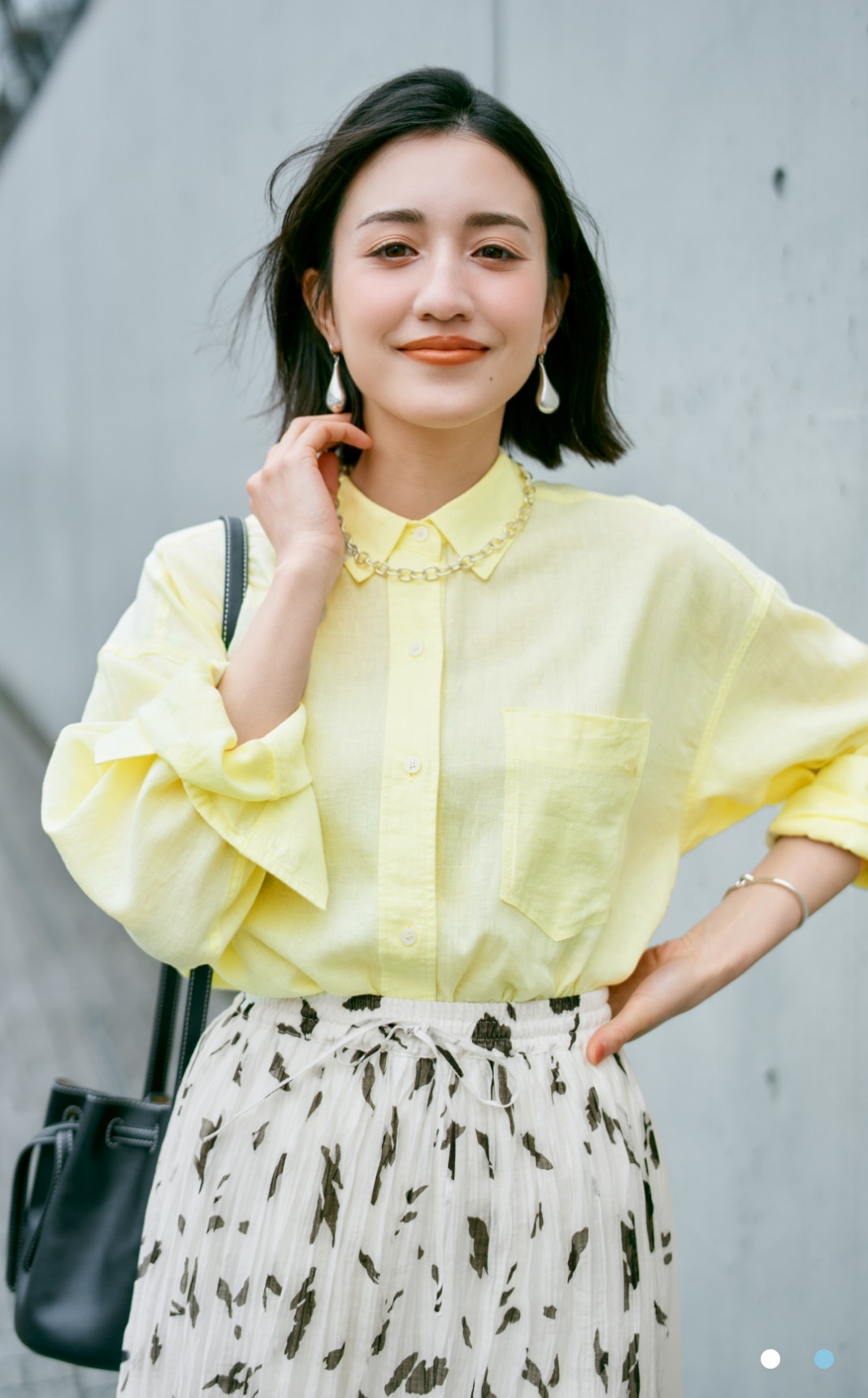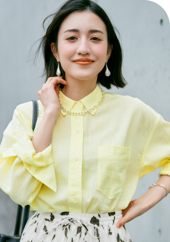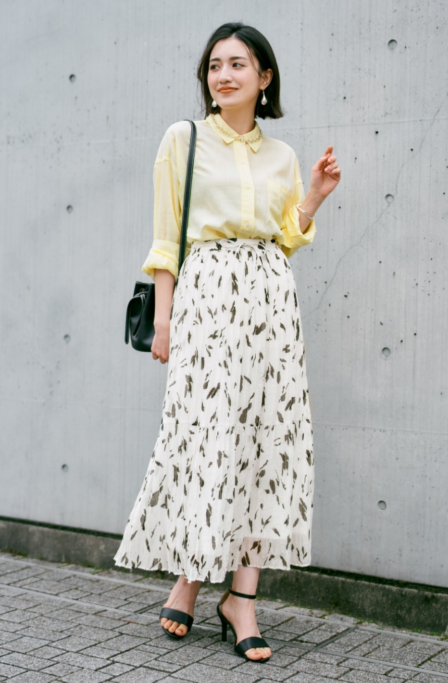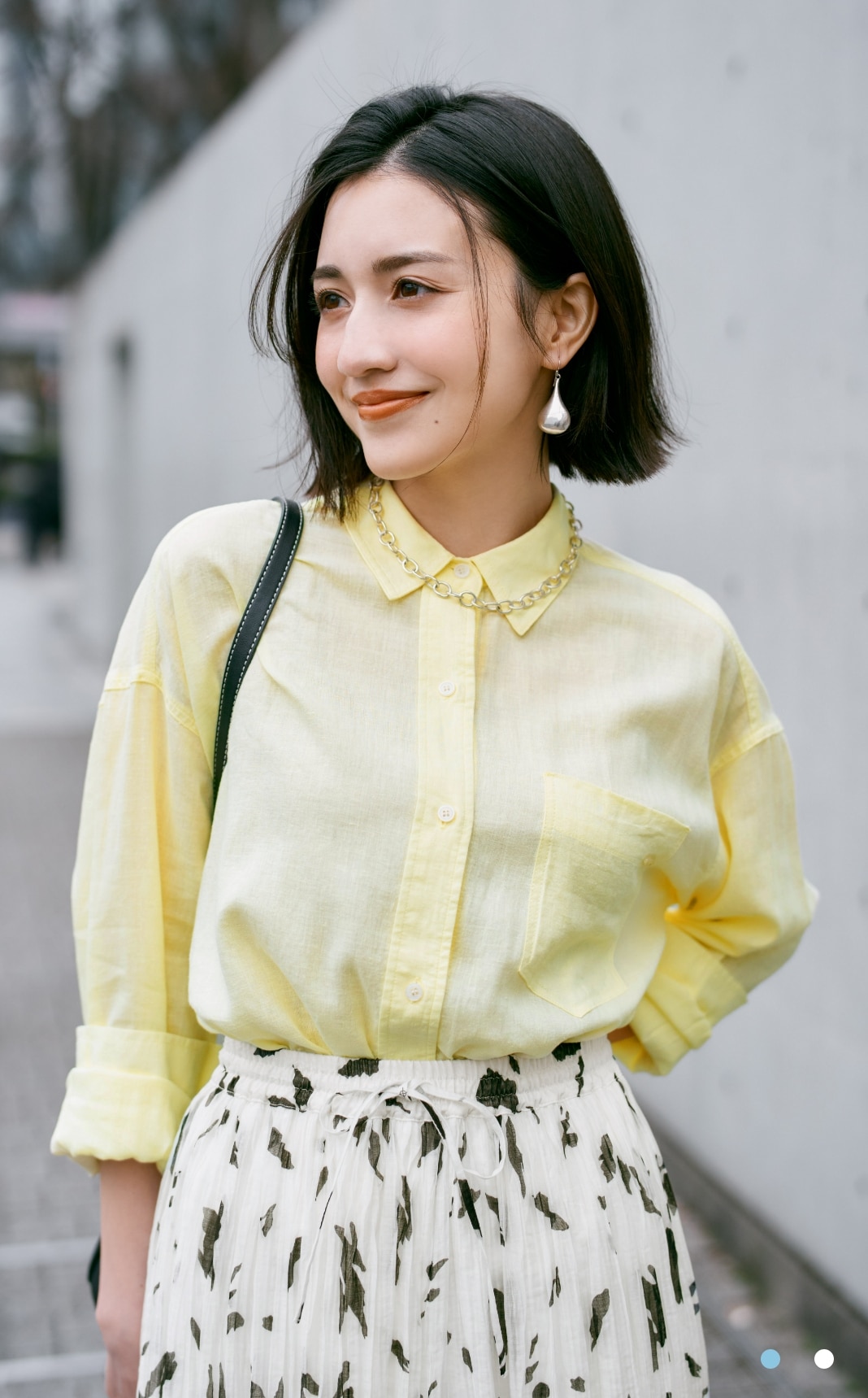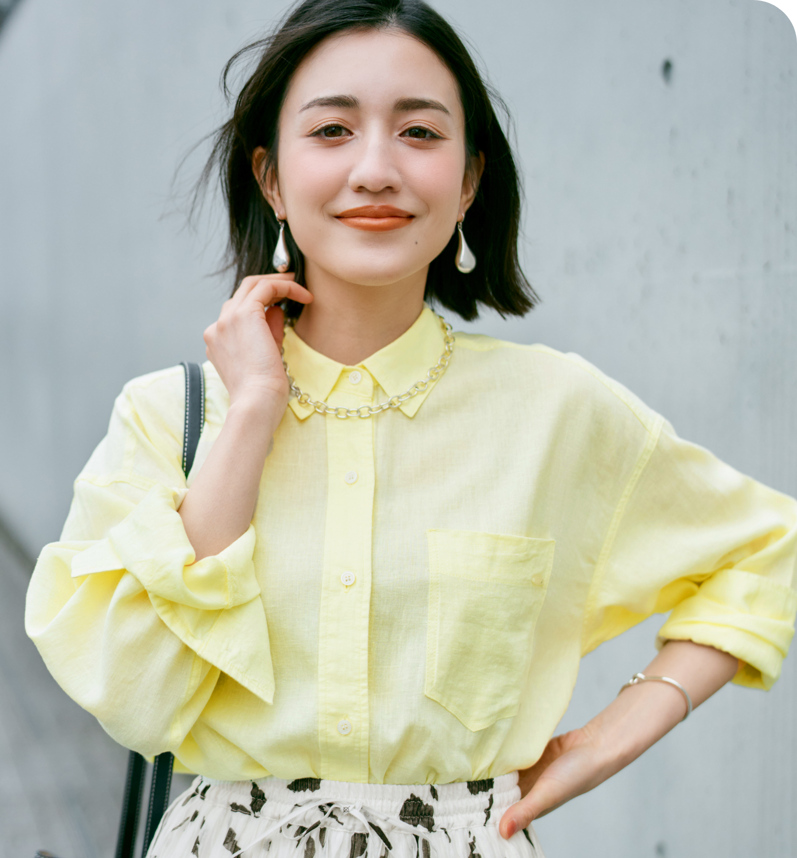 そのまま一枚で着るだけで華やかな印象になる、黄色のシャツで春を意識しました。ボタンを一番上まで閉め、ウエストをINした着こなしなら通勤にもマッチ。明るい色の力で、毎日の出社もモチベーションが上がるはず!