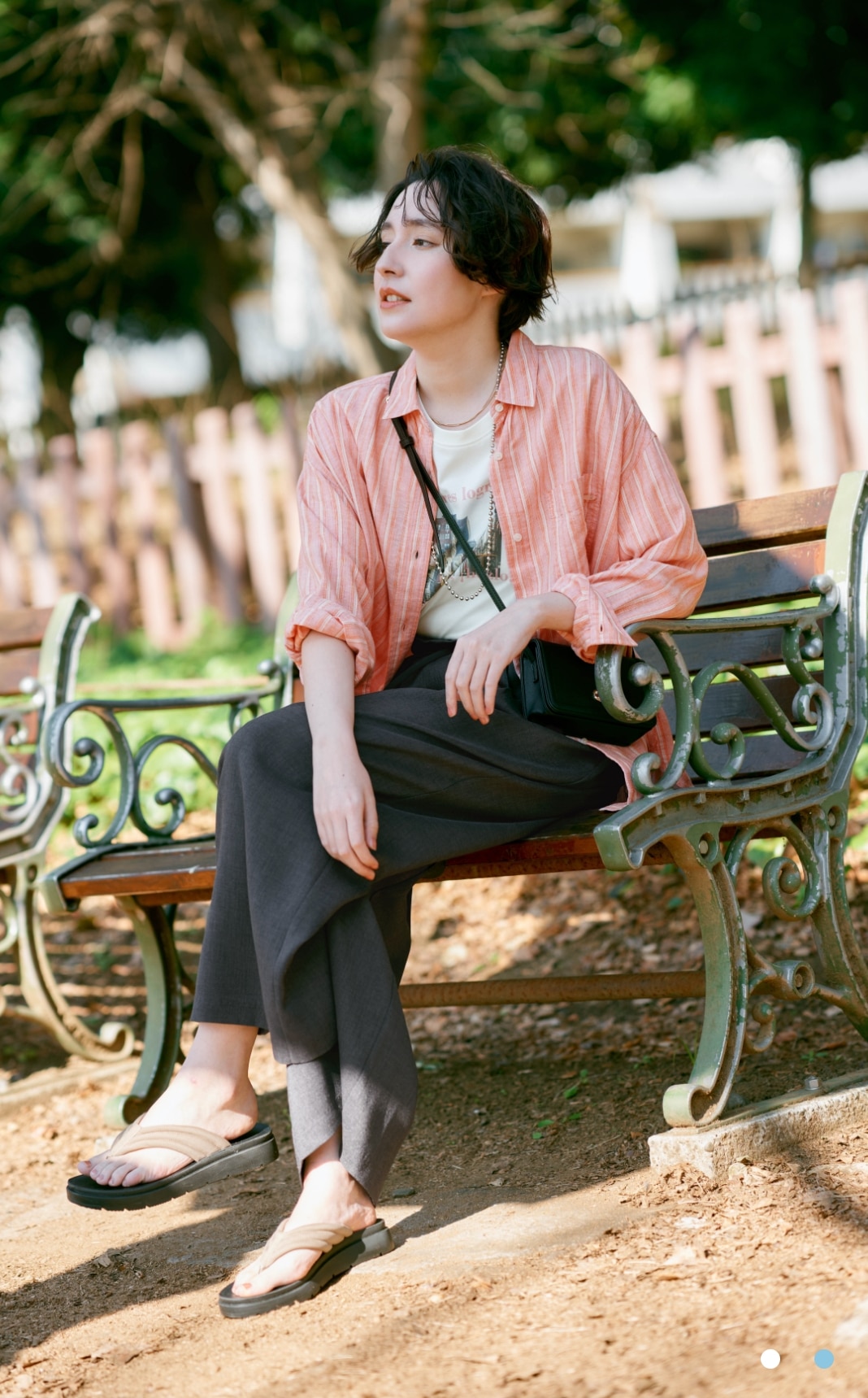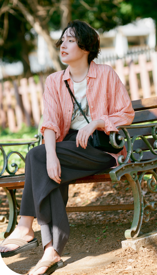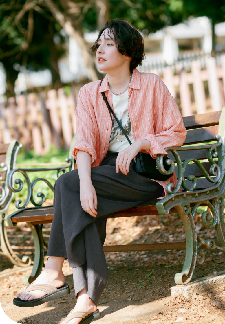 ピンクのシャツを主役にするときは、きれいめなシルエットのパンツと合わせ、カジュアルすぎないようにバランスを調整。どこか抜け感が欲しいので足元はサンダルに。この肩肘張らない、こなれたムード作りがポイントです。