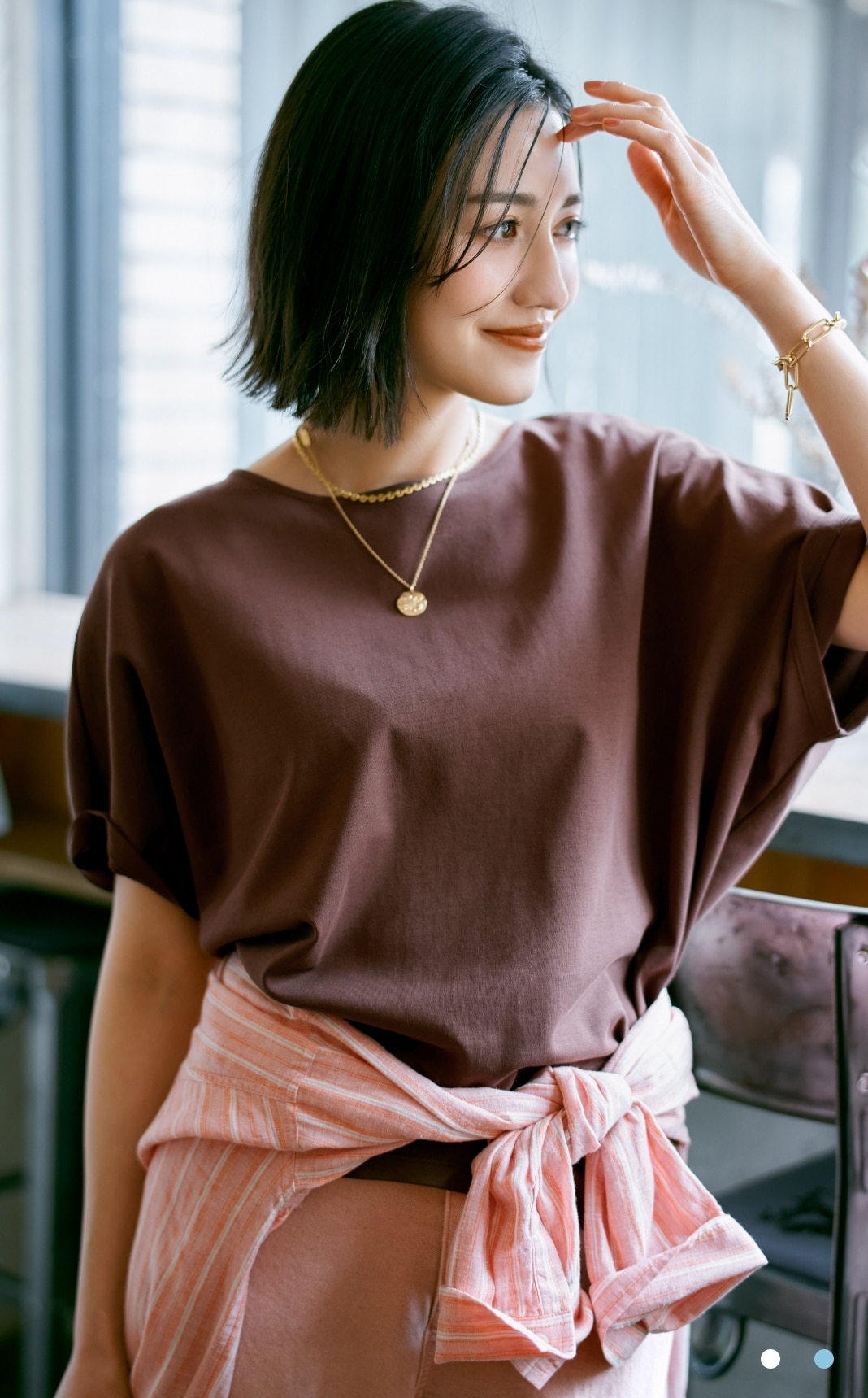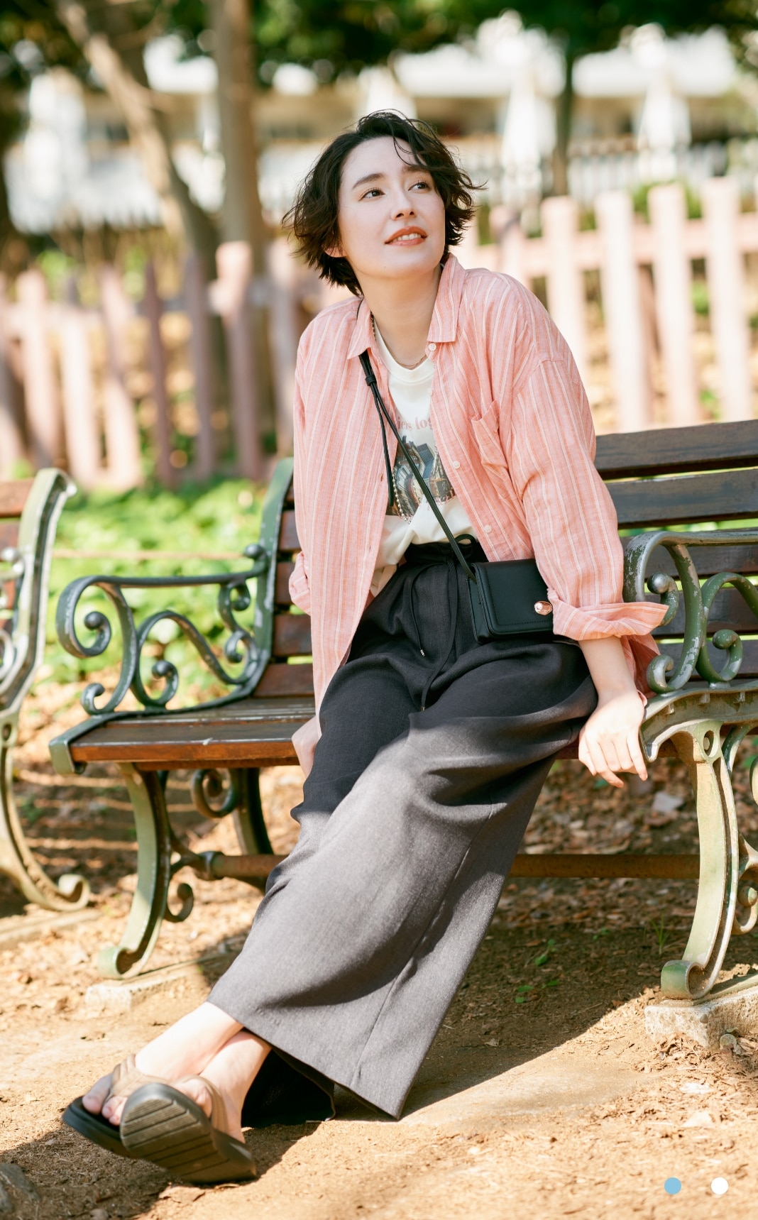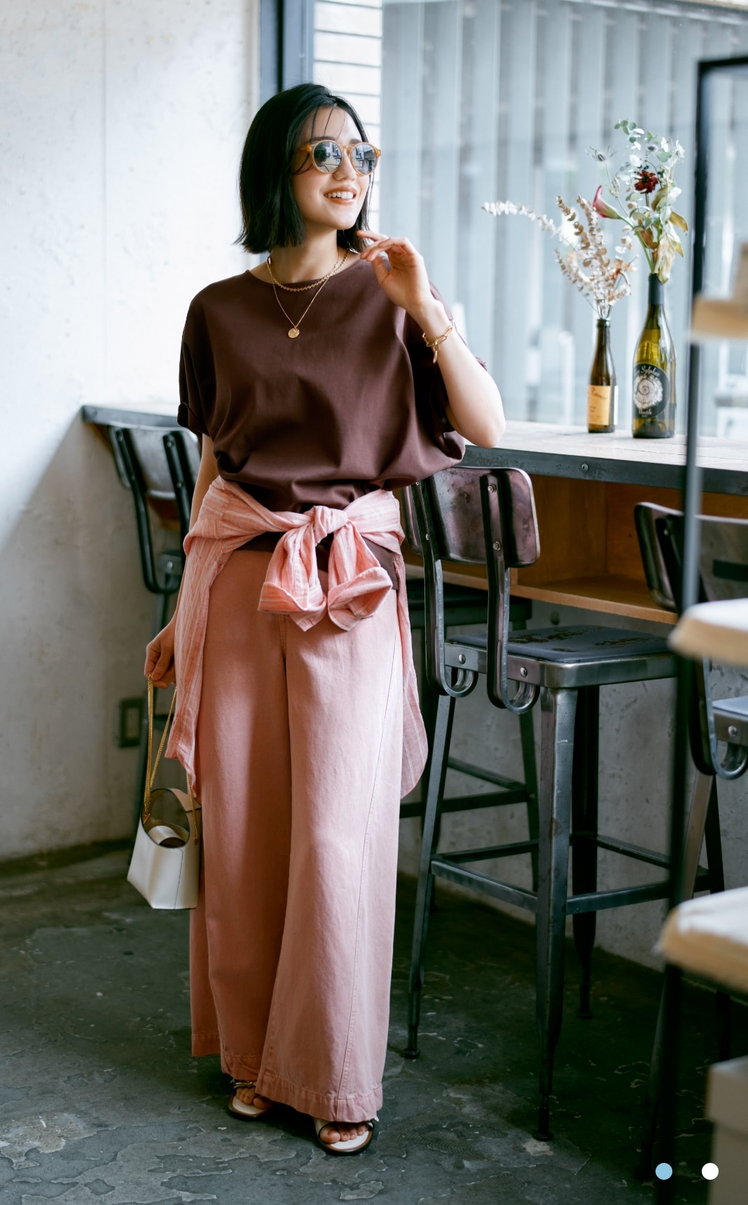 大人的にはハードルの高いピンクですが、“あえて重ねる”という逆転の発想が成功のカギ。くすみピンクのパンツに合わせ、さらにアースカラーのTシャツで馴染ませれば、甘さを抑えつつ女性らしさを残したスタイルに。