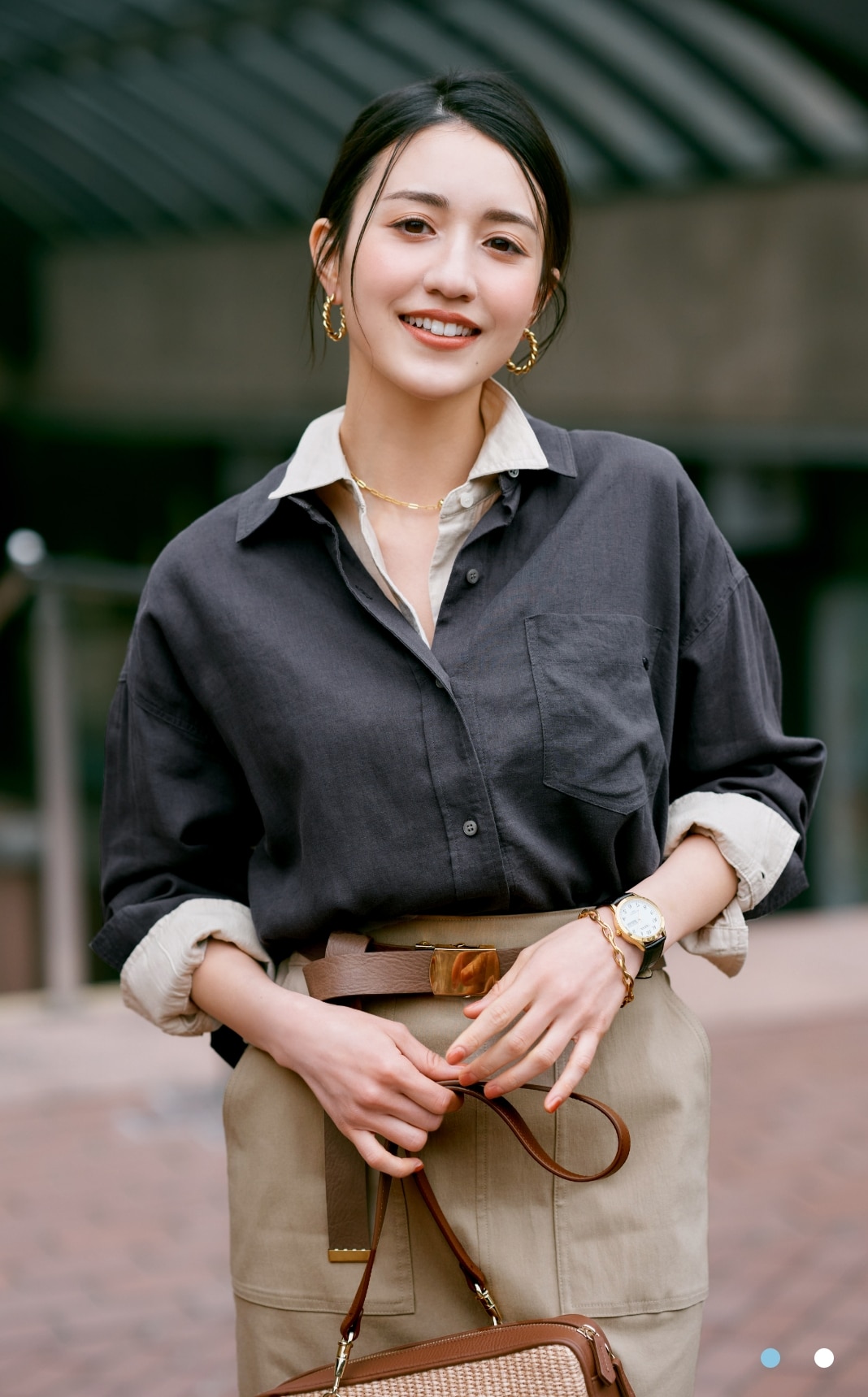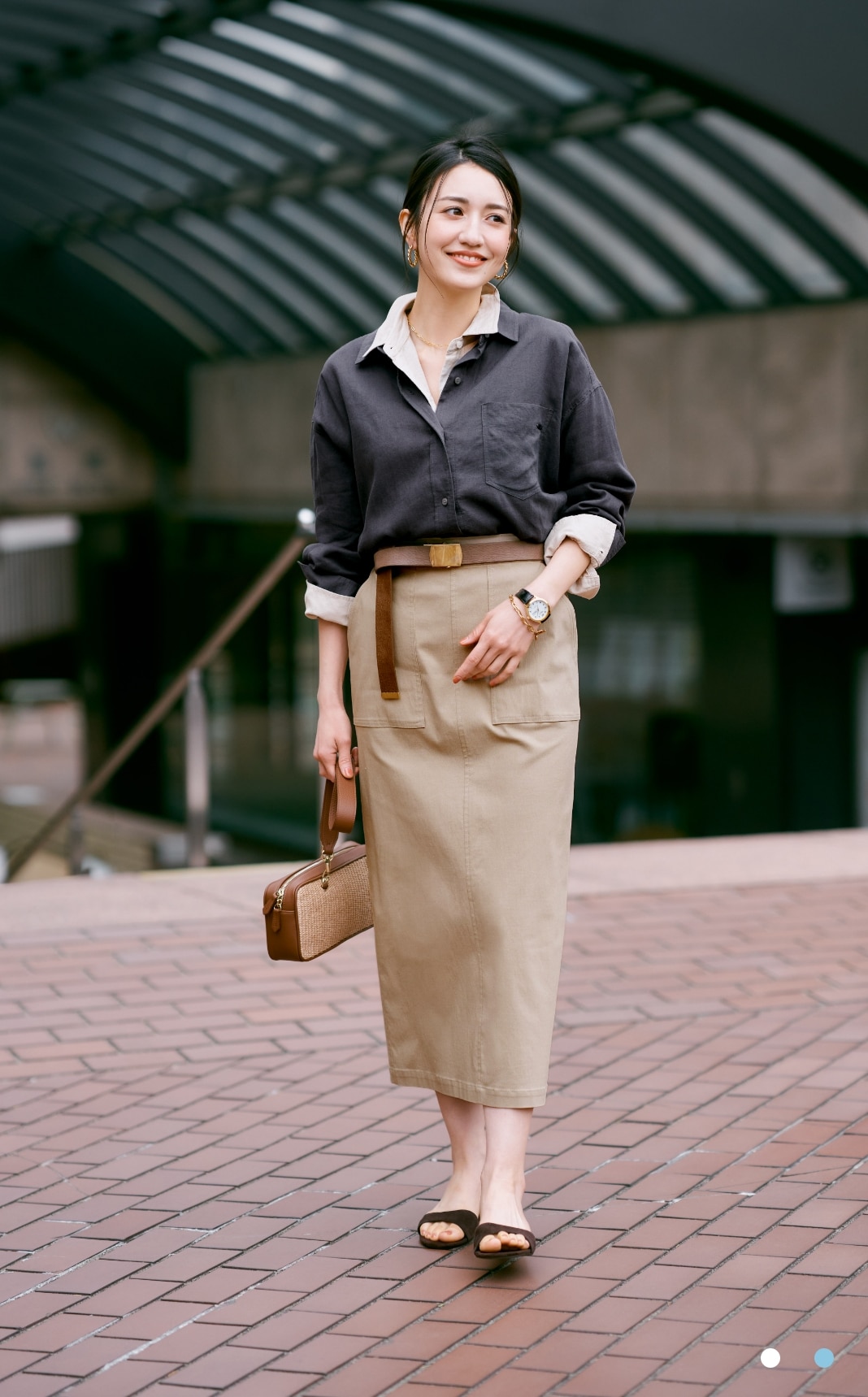 トレンドのシャツの重ね着をするなら、合わせやすいスレートグレーをベースに、中にベージュをIN。ボトムには旬のチノスカートを。ペンシルタイプを選べばきちんと感をキープしたまま、今どきのおしゃれ心も満たしてくれます。