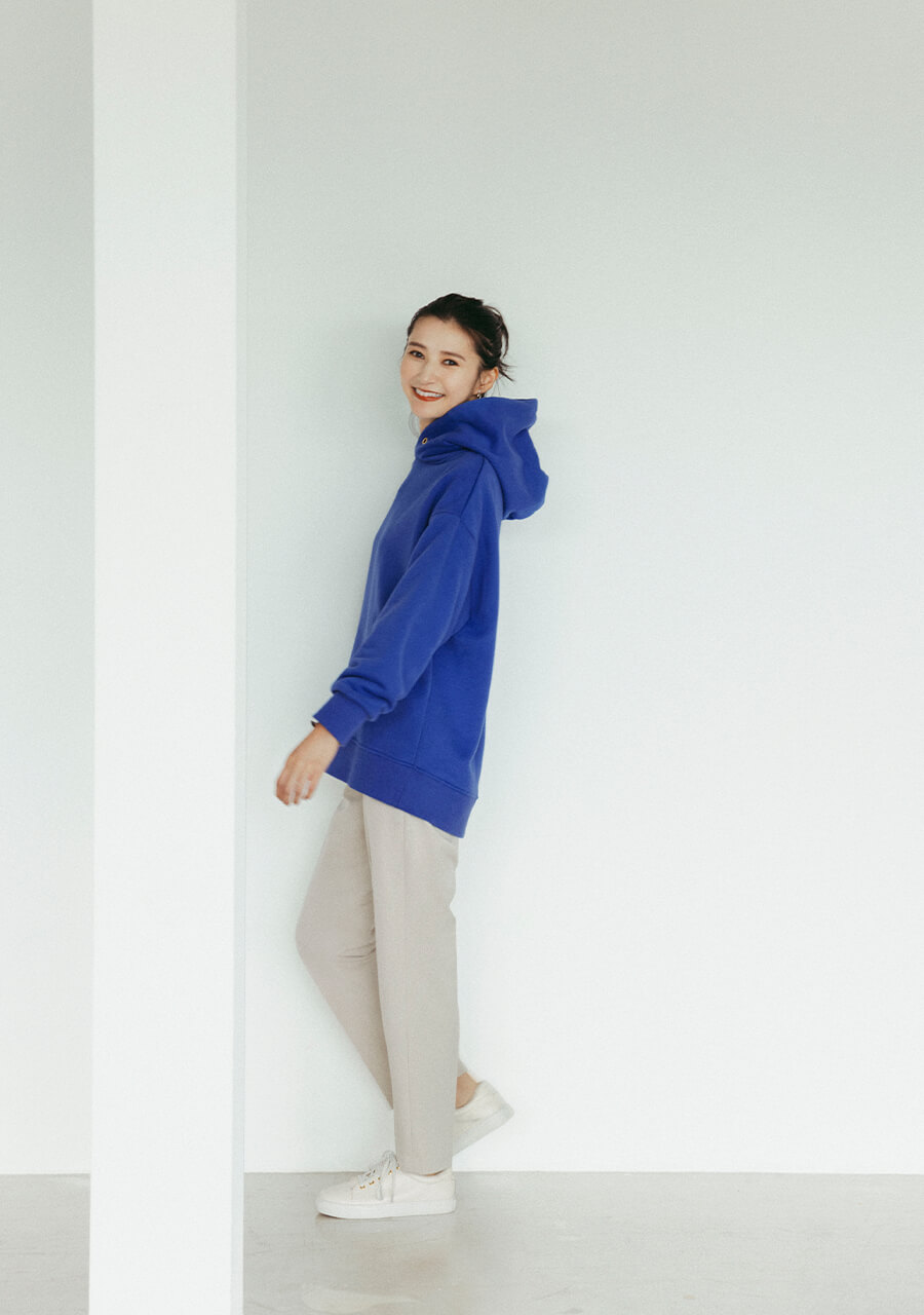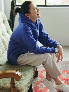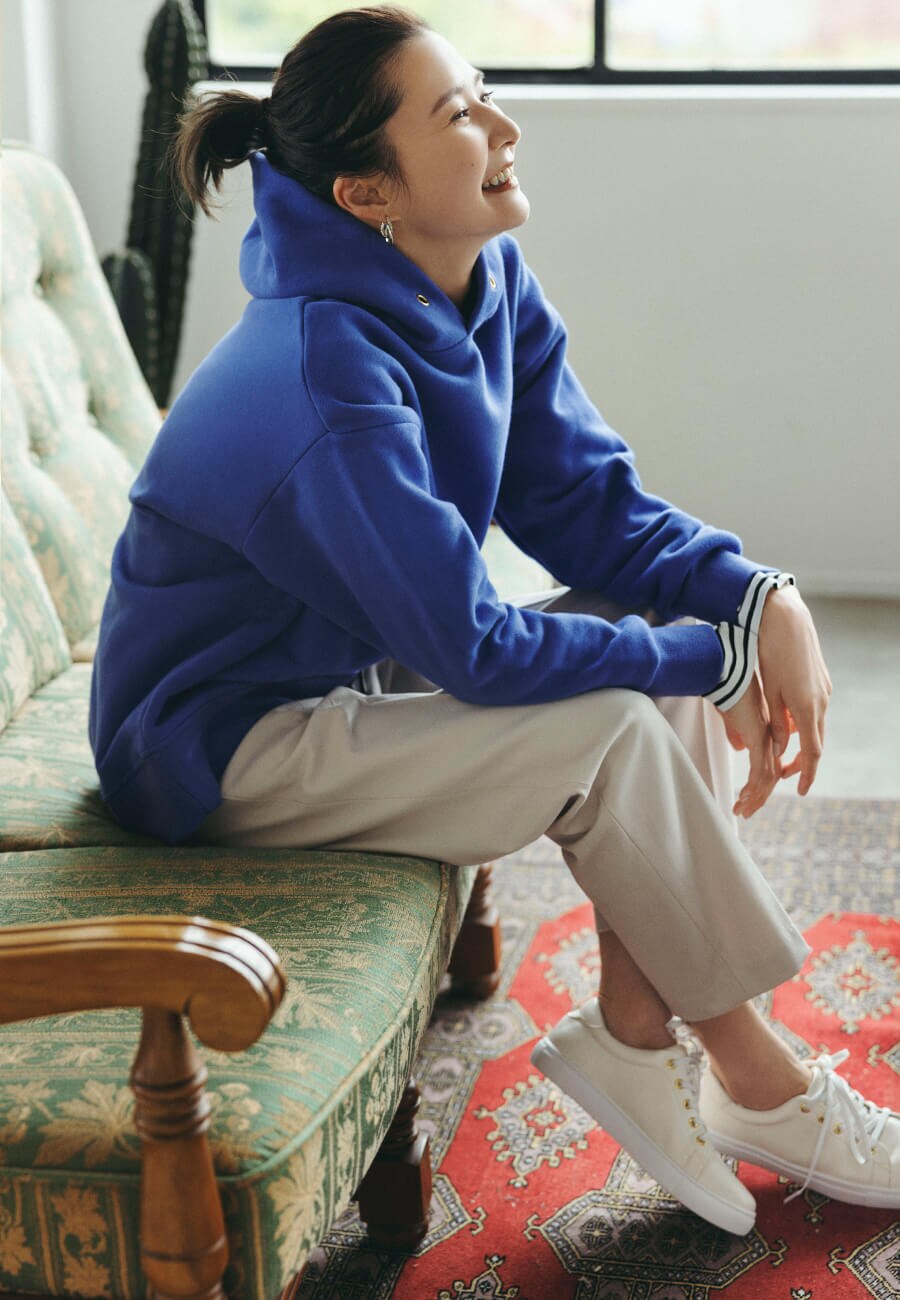 よくゆるっと感のある鮮やかブルーのパーカー合