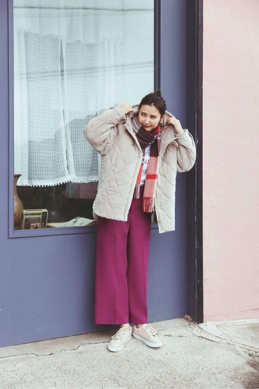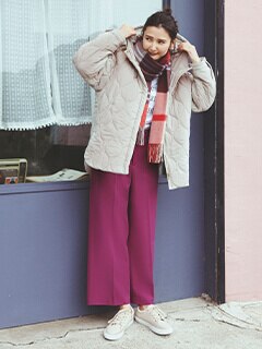 ワイドパンツには着膨れしないキルトブルゾンが
